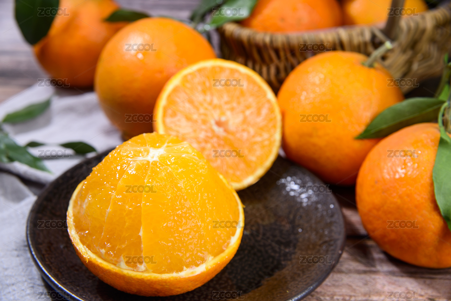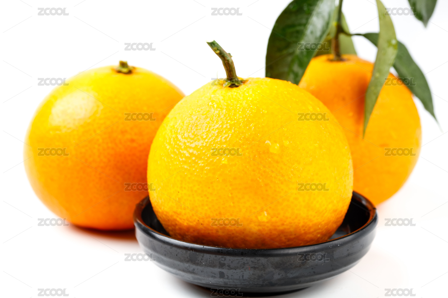 白底上的兩個(gè)愛媛橙臍橙和一個(gè)裝在碟子里的橙子