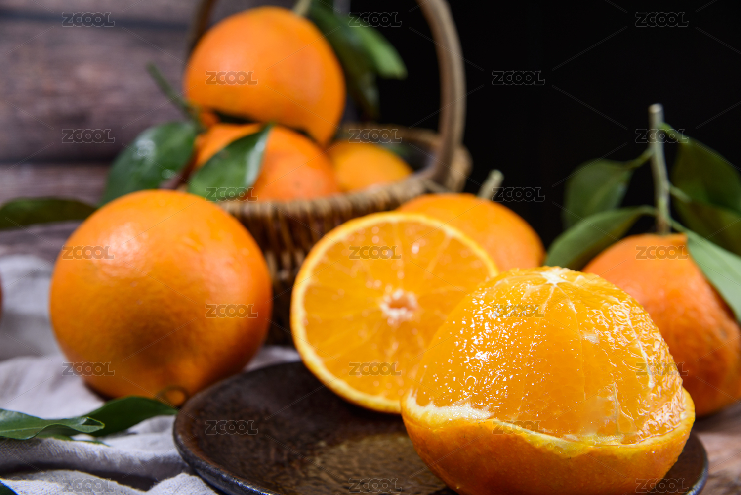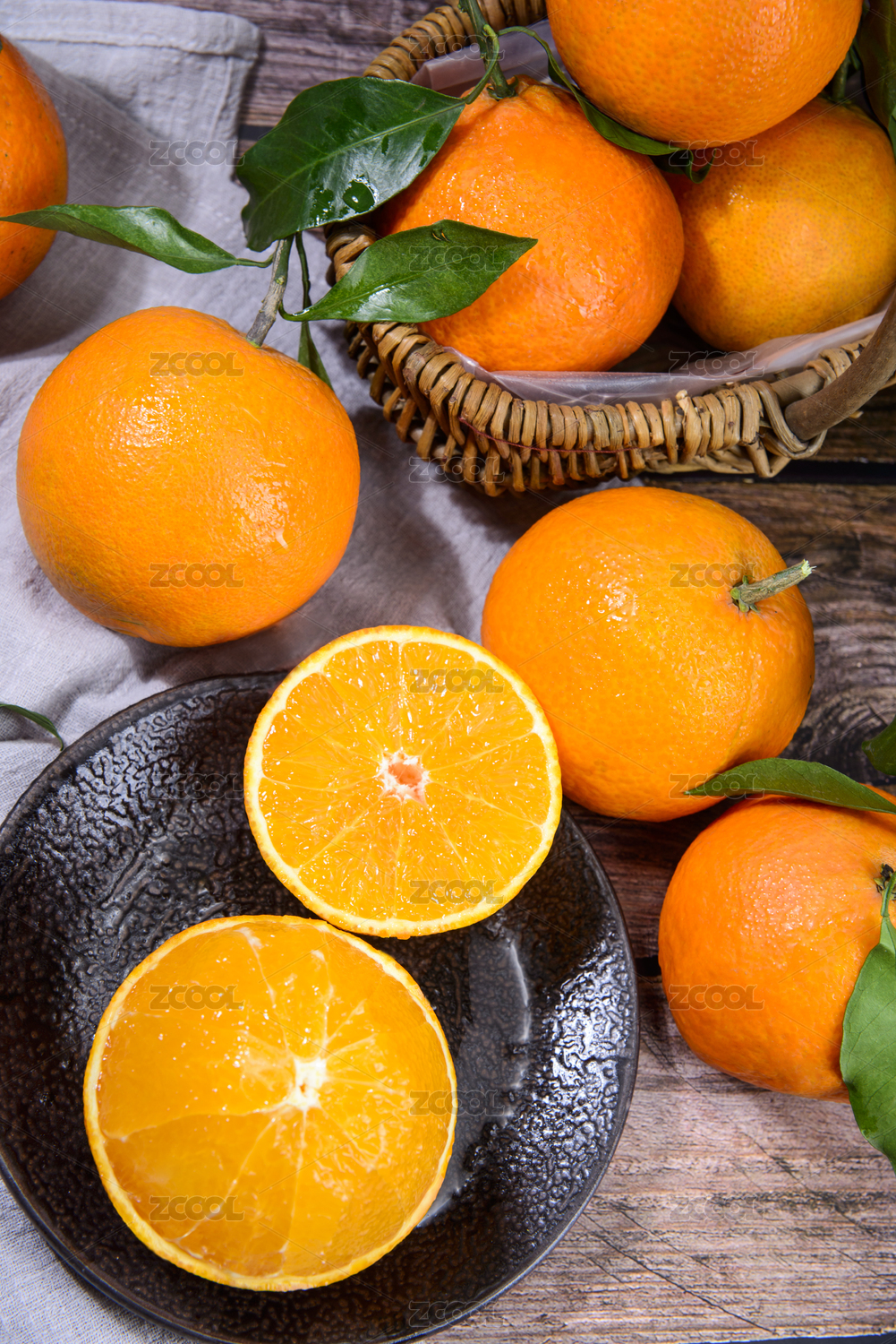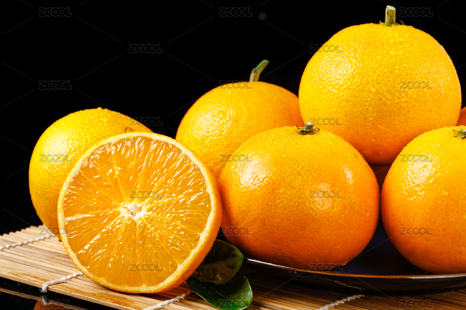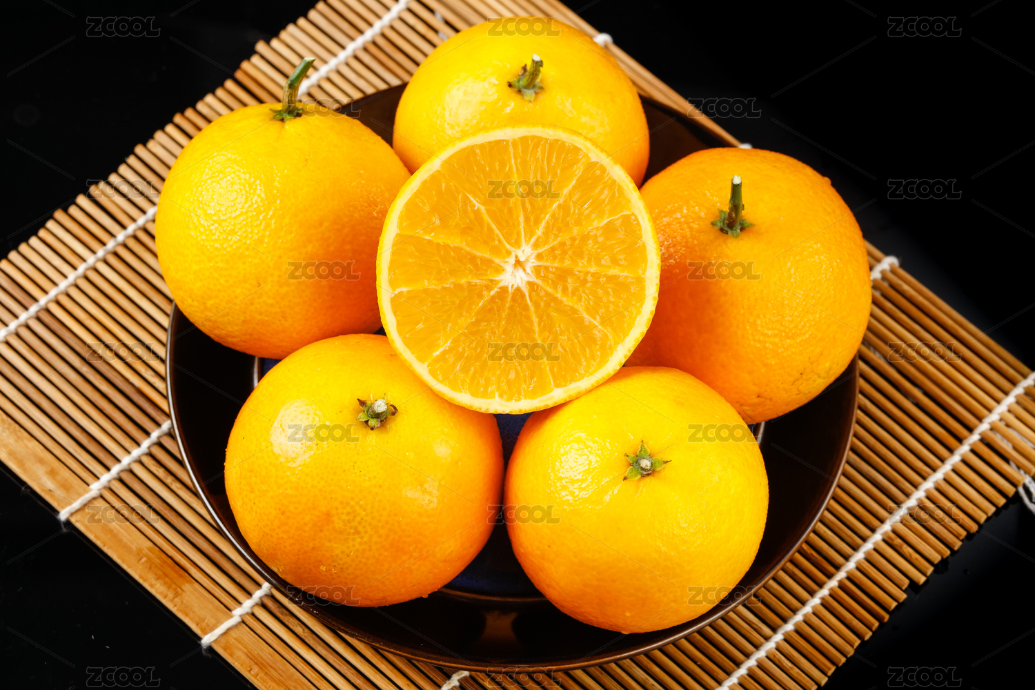 黑底木墊子上俯拍盤子裝著的愛媛橙和果肉切面