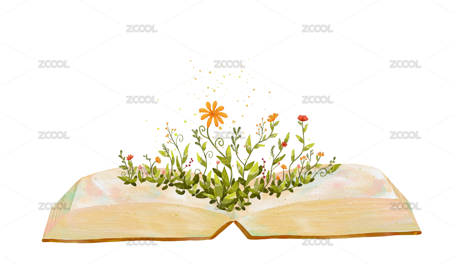 翻開的書頁上長出茂盛的花草 可愛植物水彩插畫