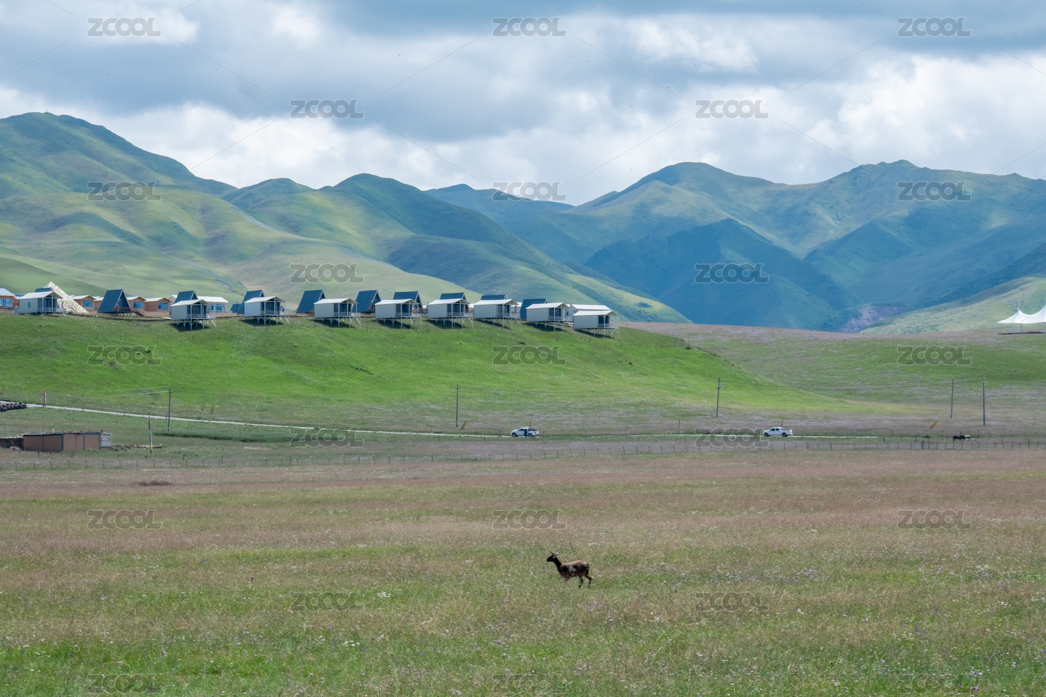 夏天甘肅甘南藏族自治州草原上的木屋與花草