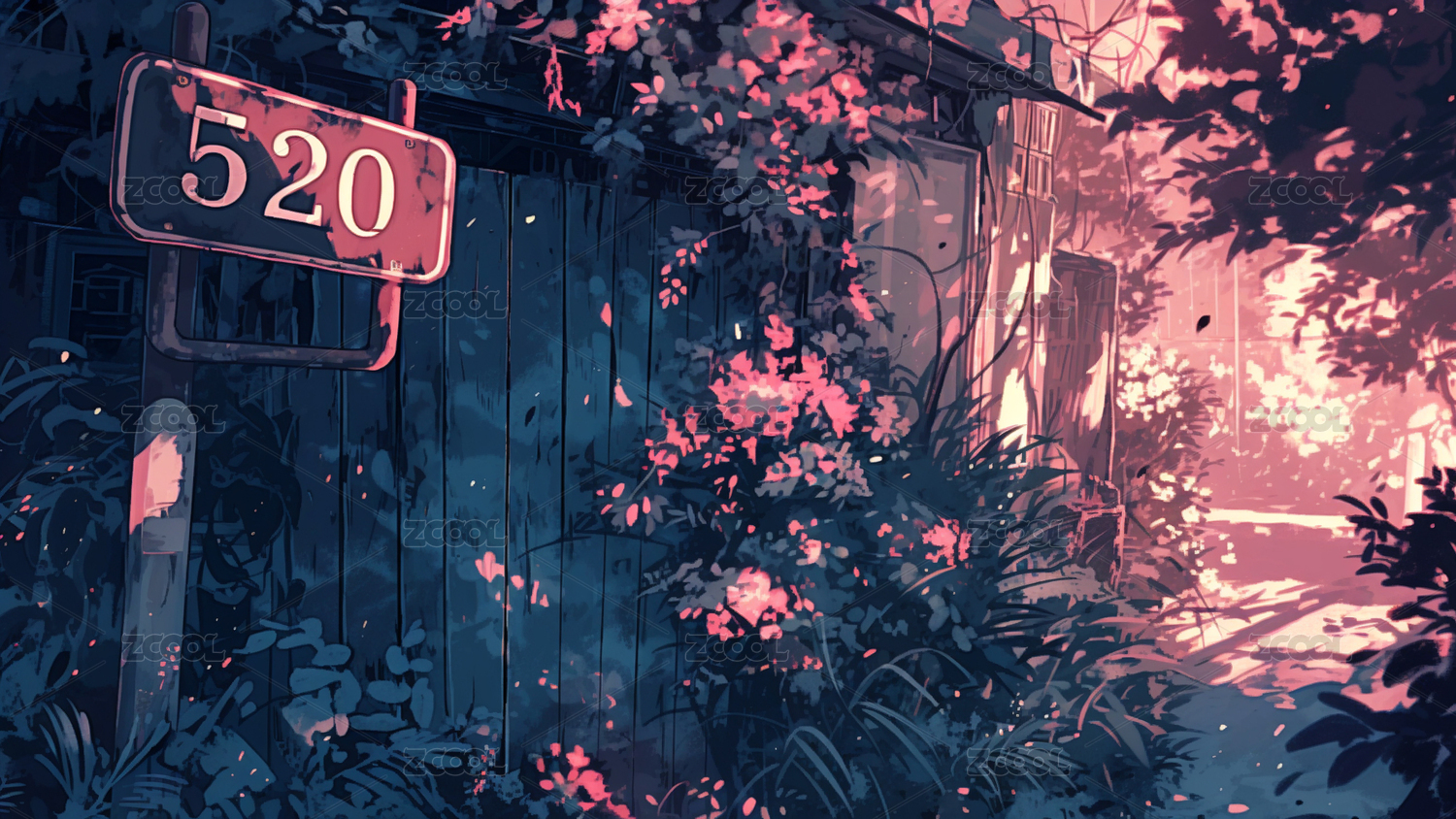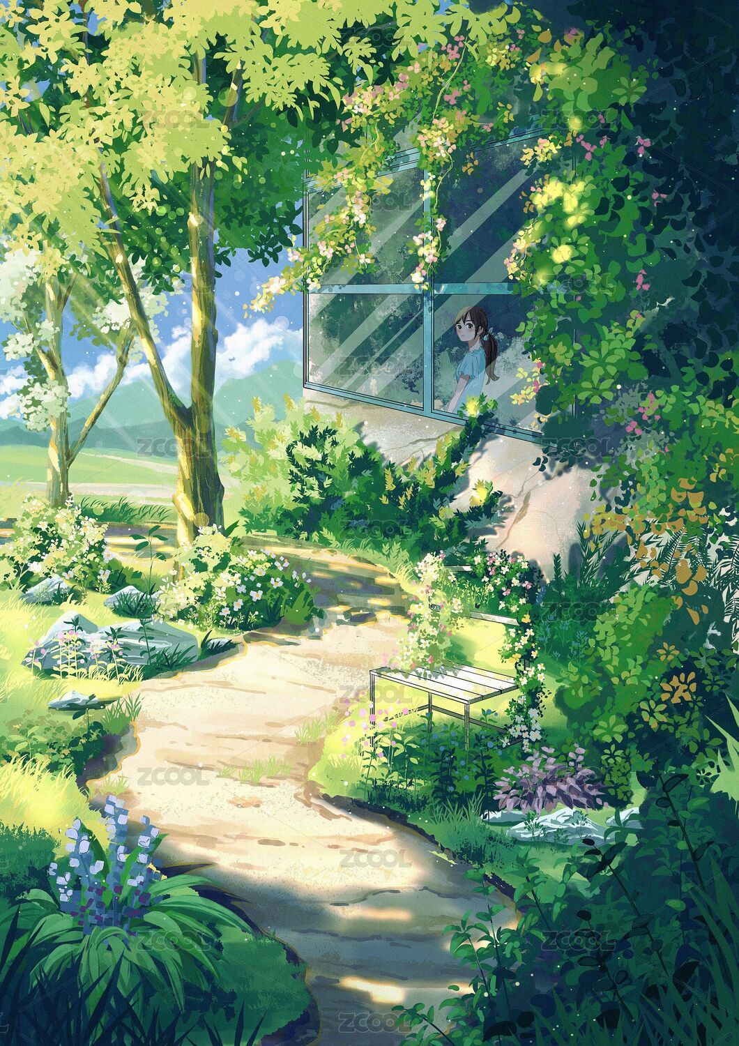 綠色調花園插畫場景壁紙樹花草