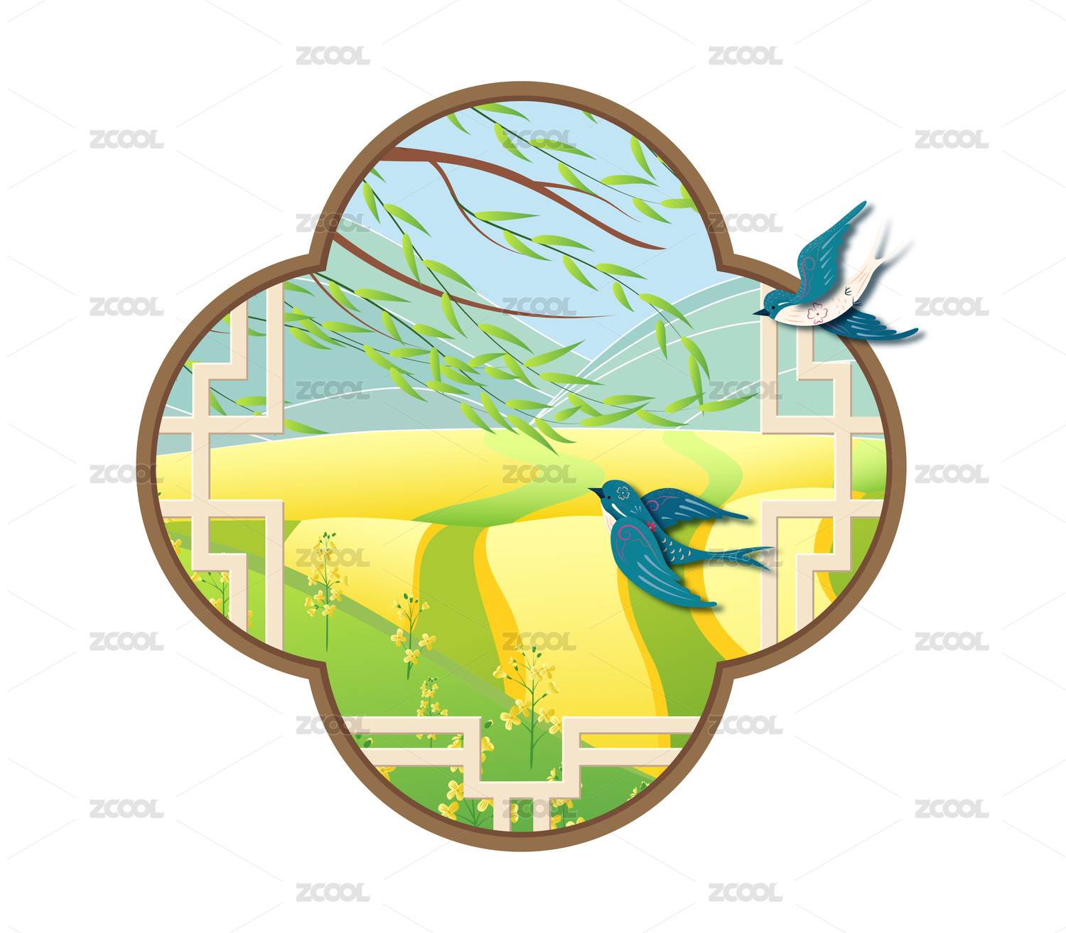 中國風(fēng)古典窗戶與田園風(fēng)景