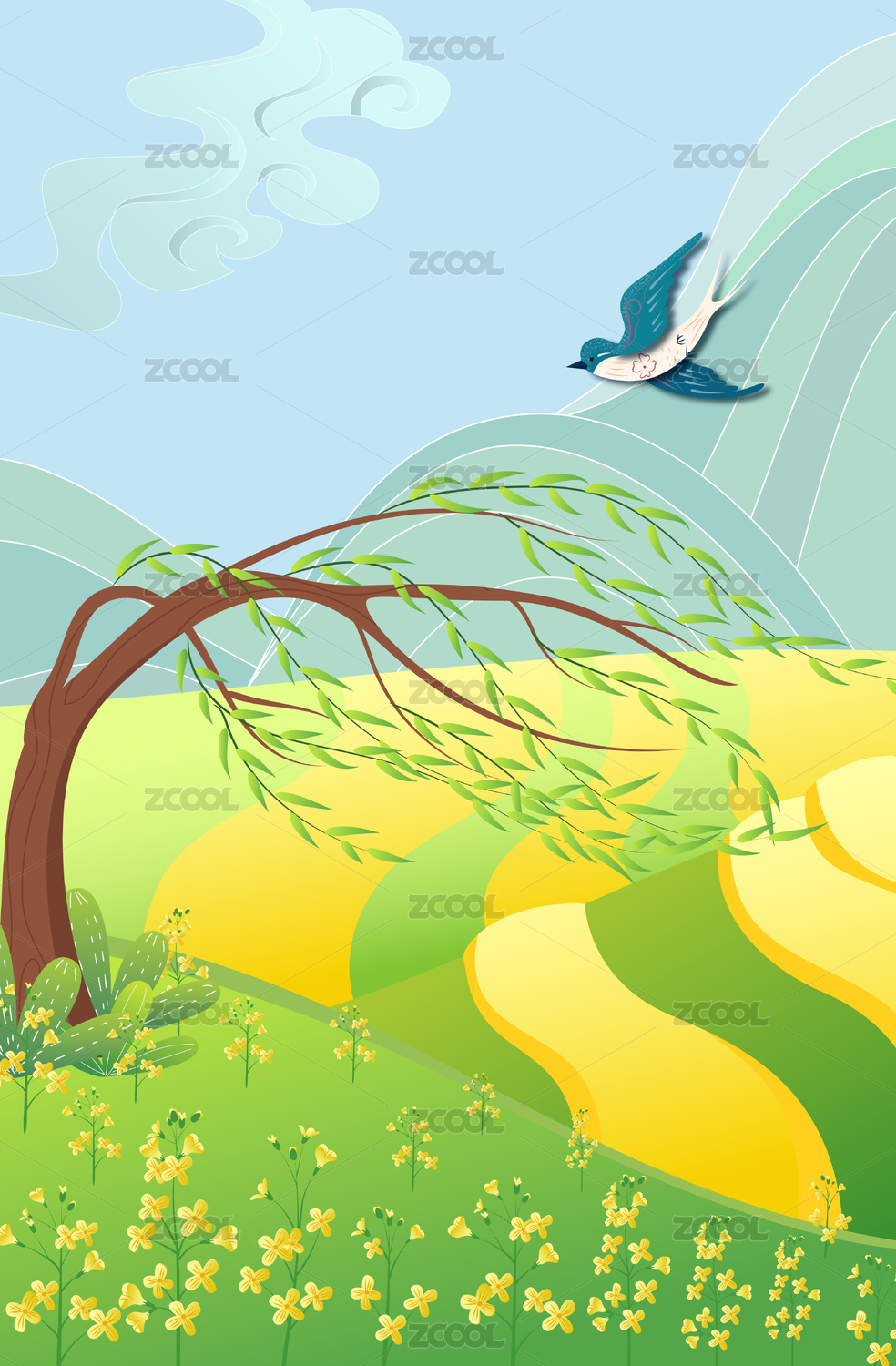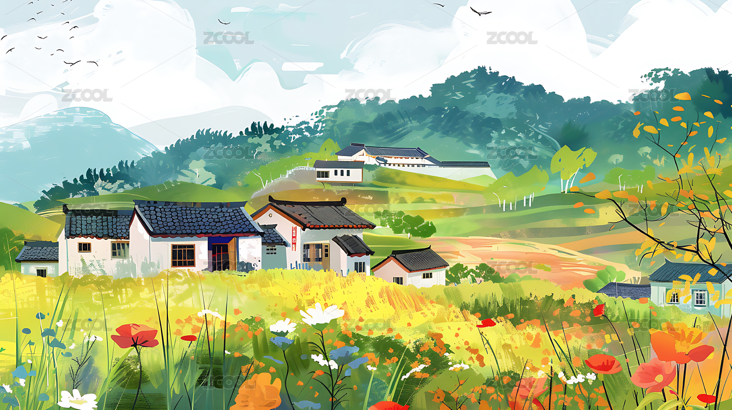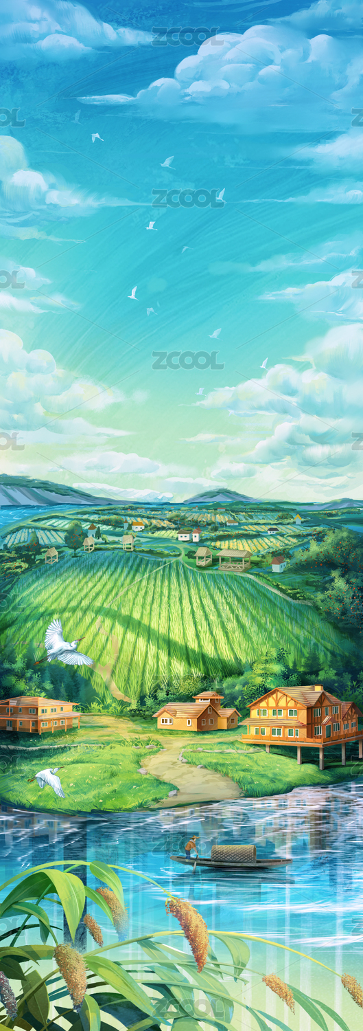 手繪田園風(fēng)光中國畫山水風(fēng)景畫