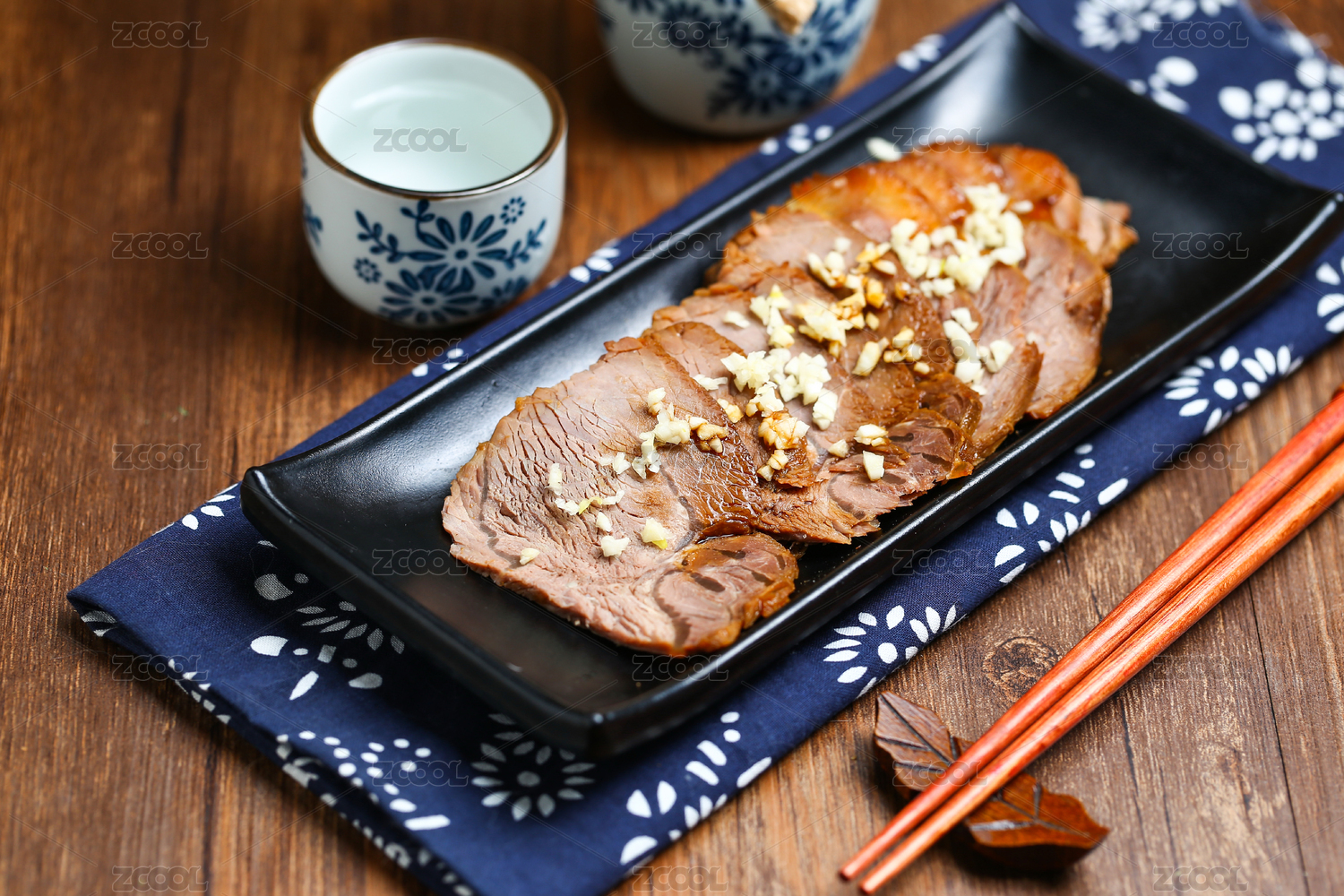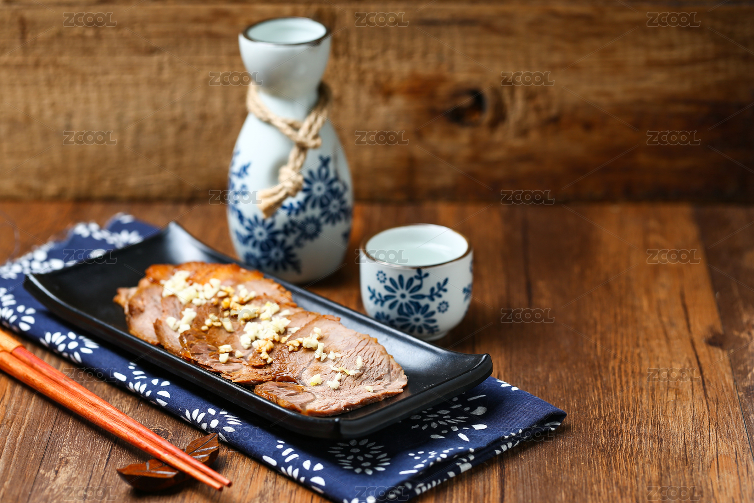 黑色盤子里的醬牛肉和白酒酒壺酒杯酒具放在木桌上