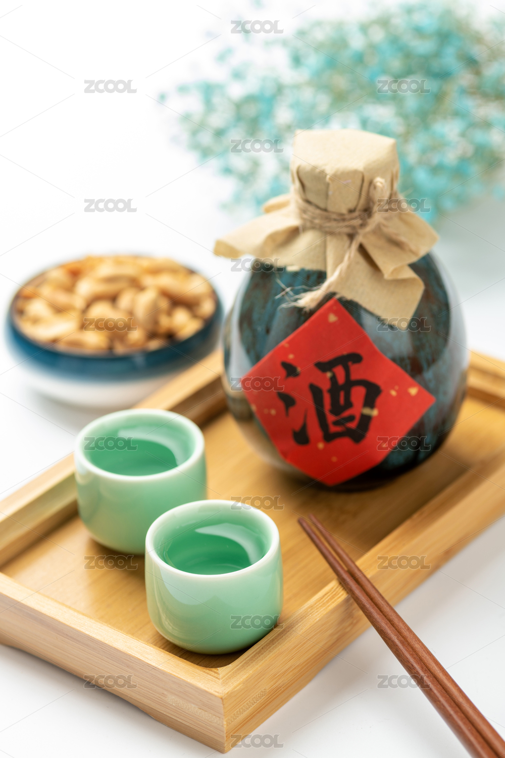 梅子青酒壺酒杯擺放在紅色灑金背景上旁邊放有中國結木托盤