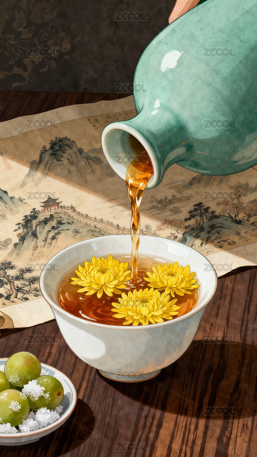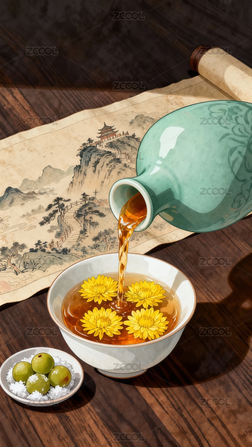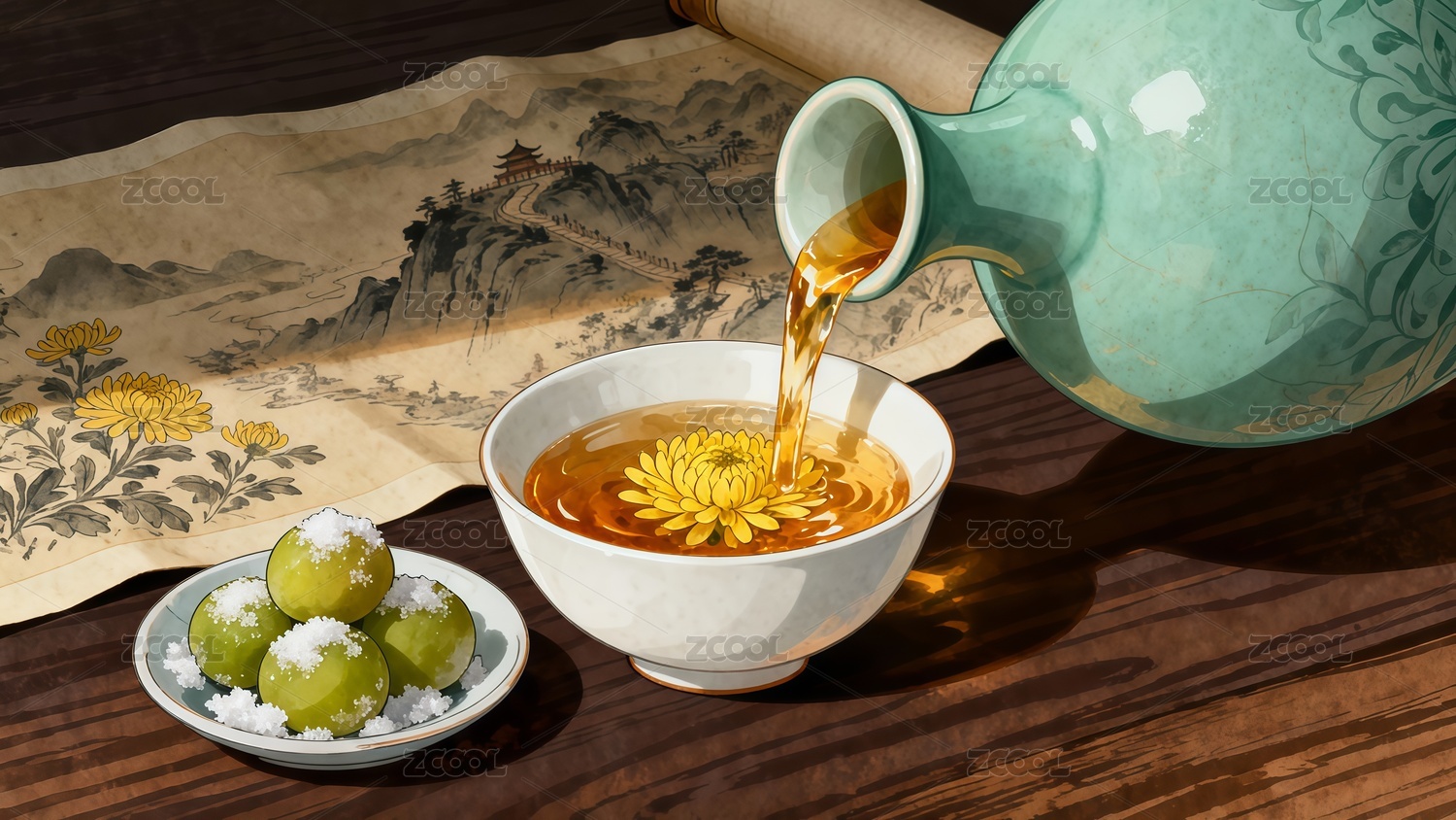 夏天的感覺特寫古代中式房子陽臺上擺著酒壺酒杯和花