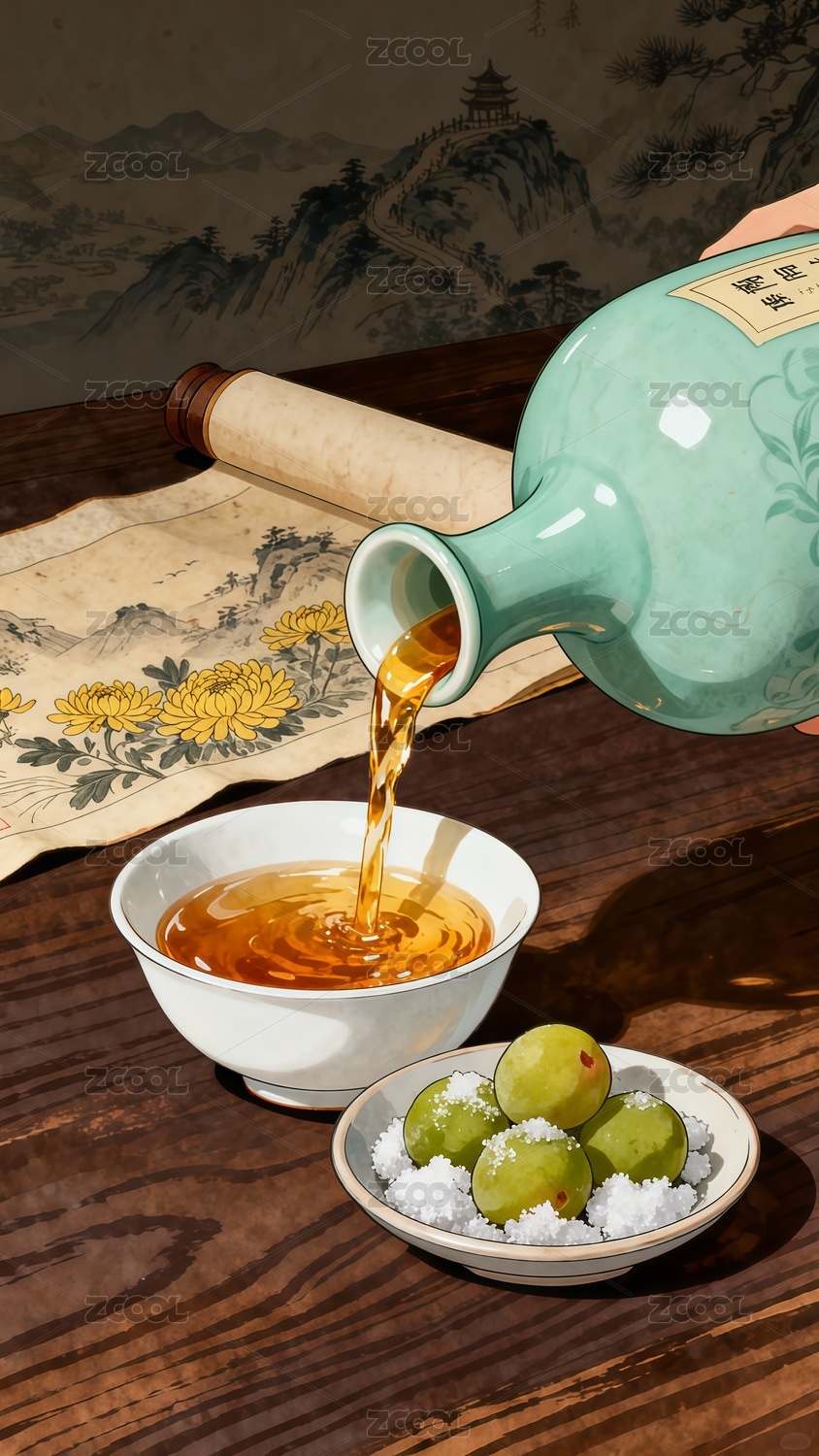 酒壺酒壇酒杯特寫木桌面窗欞影