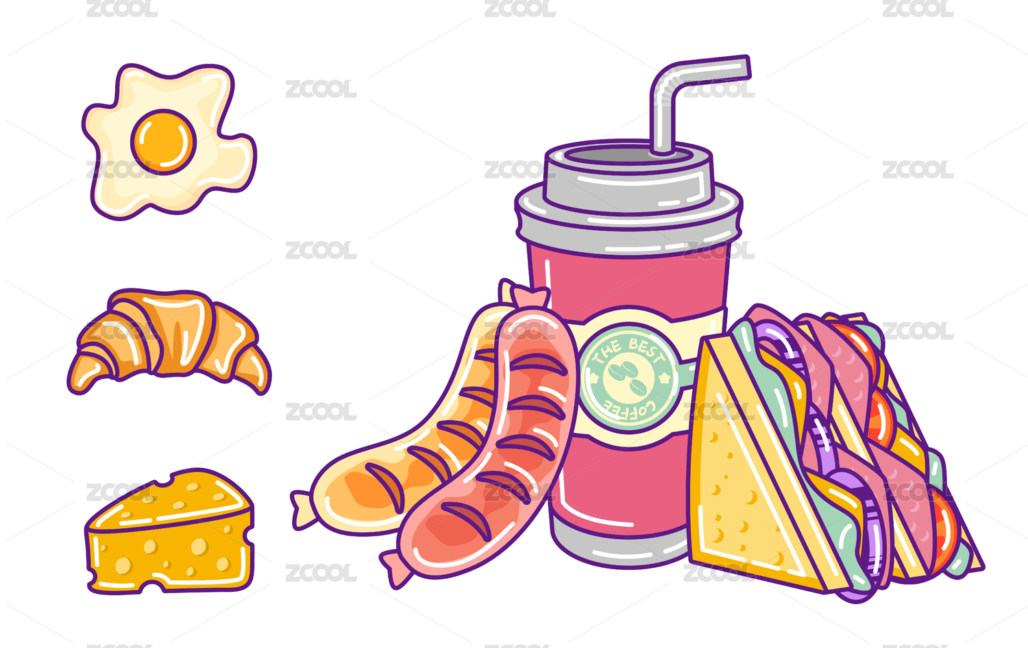 矢量 卡通三明治香腸咖啡美食組合