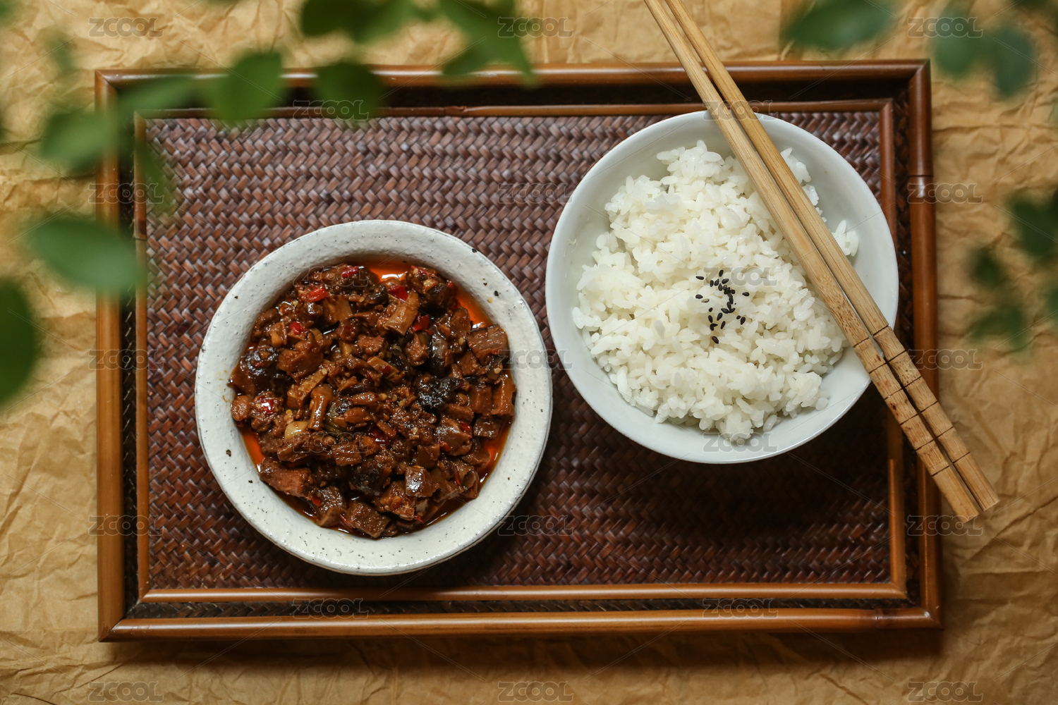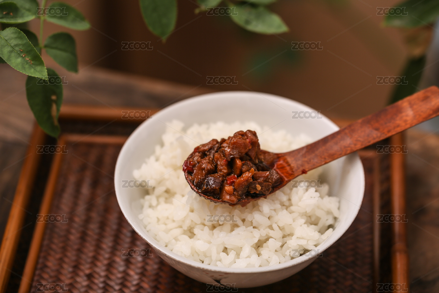 米飯上有一勺可口的牛肉醬