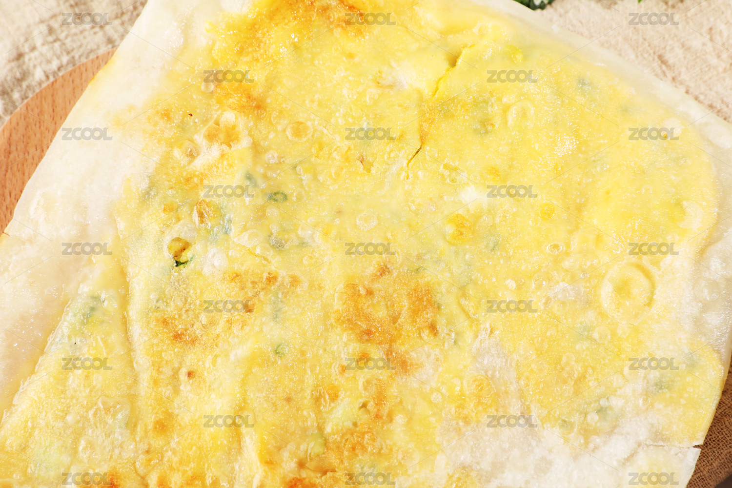 黃色的雞蛋灌餅放在木紋桌面上