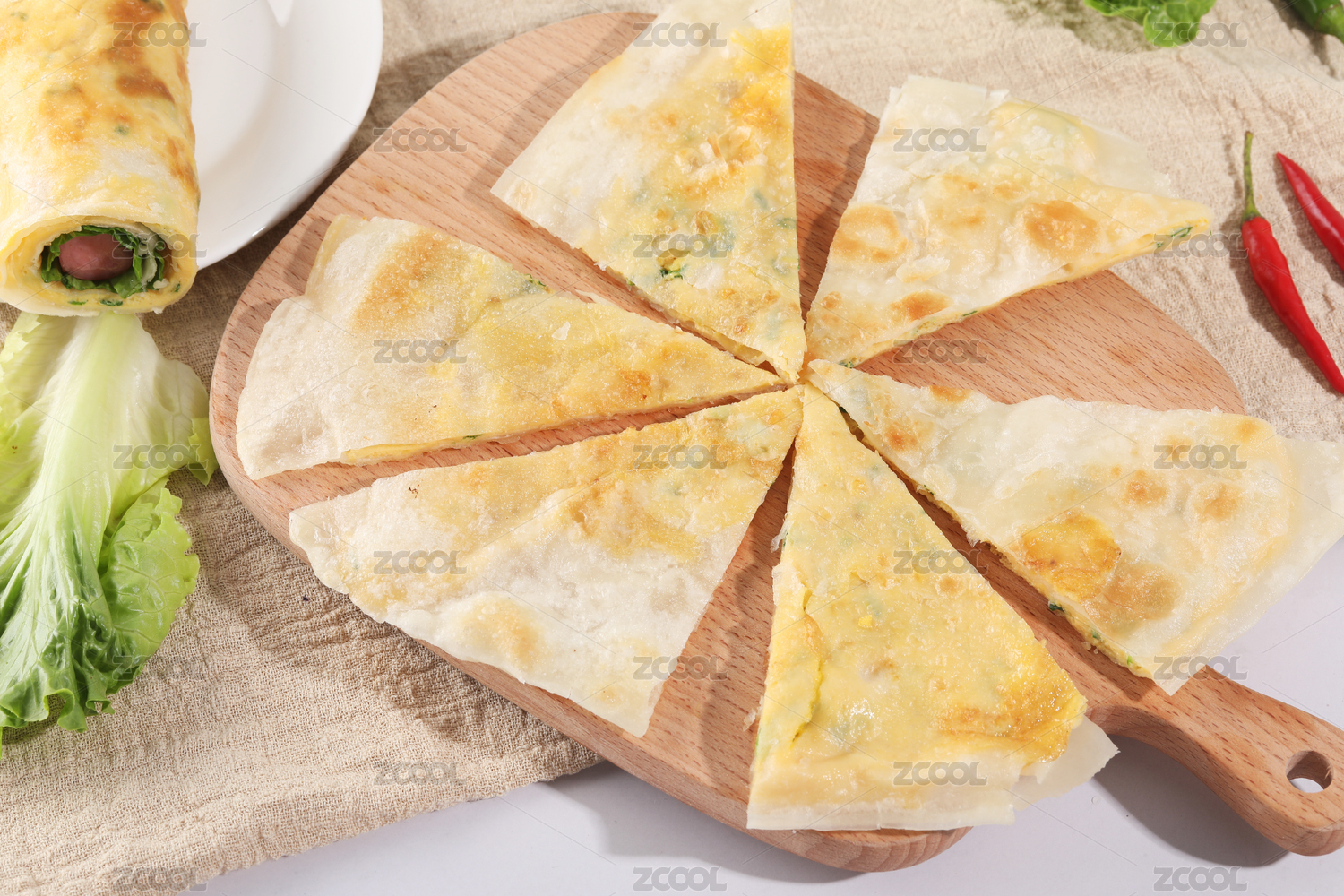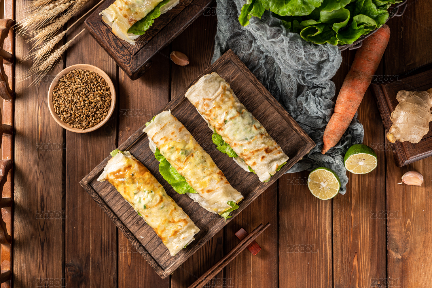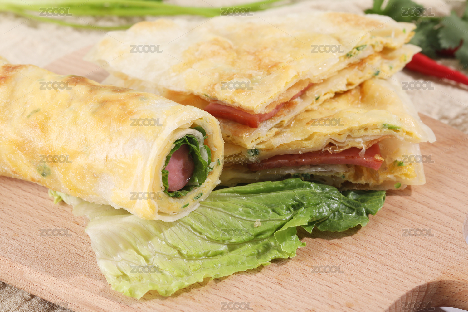 木板背景上的傳統(tǒng)美食小吃雞蛋灌餅