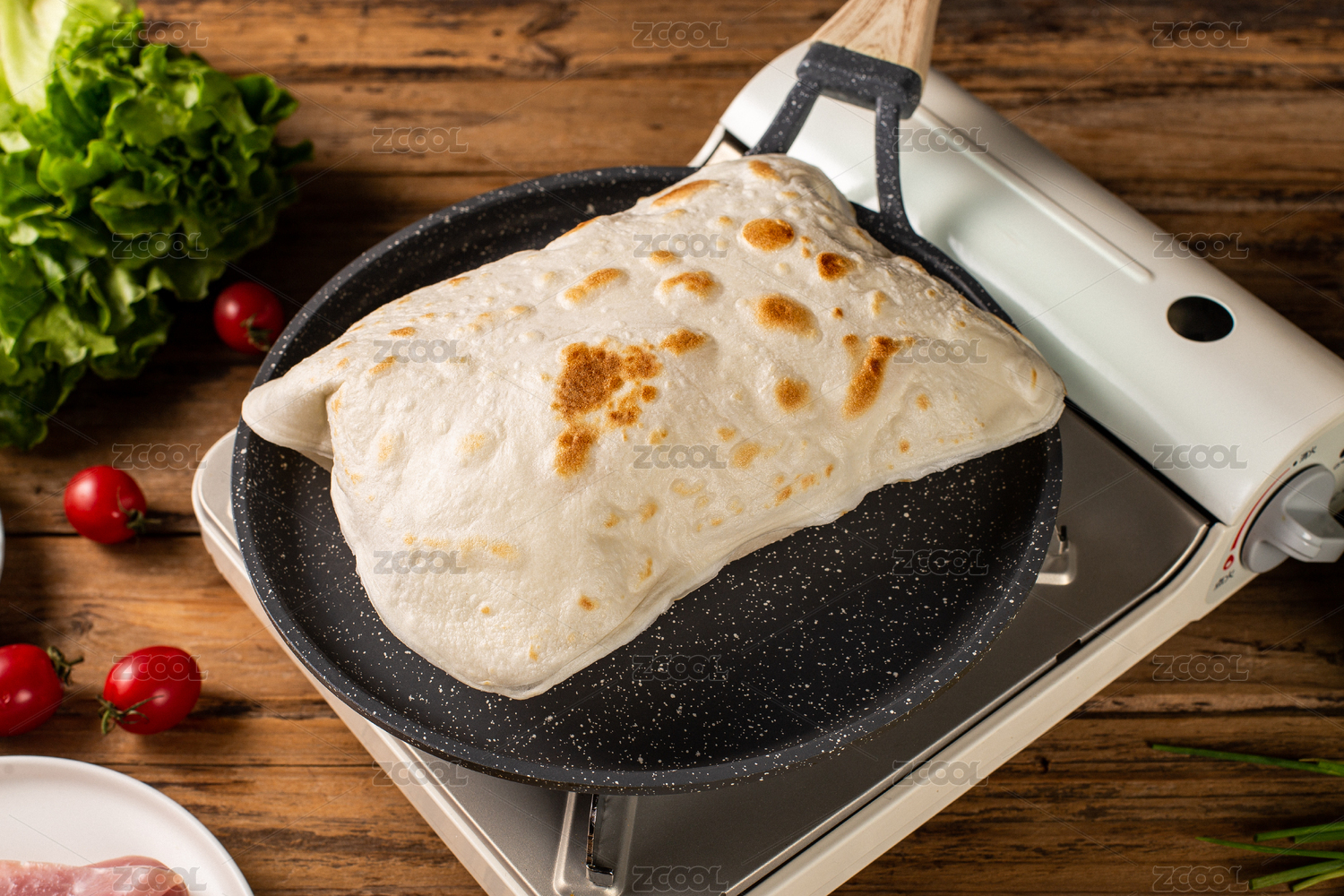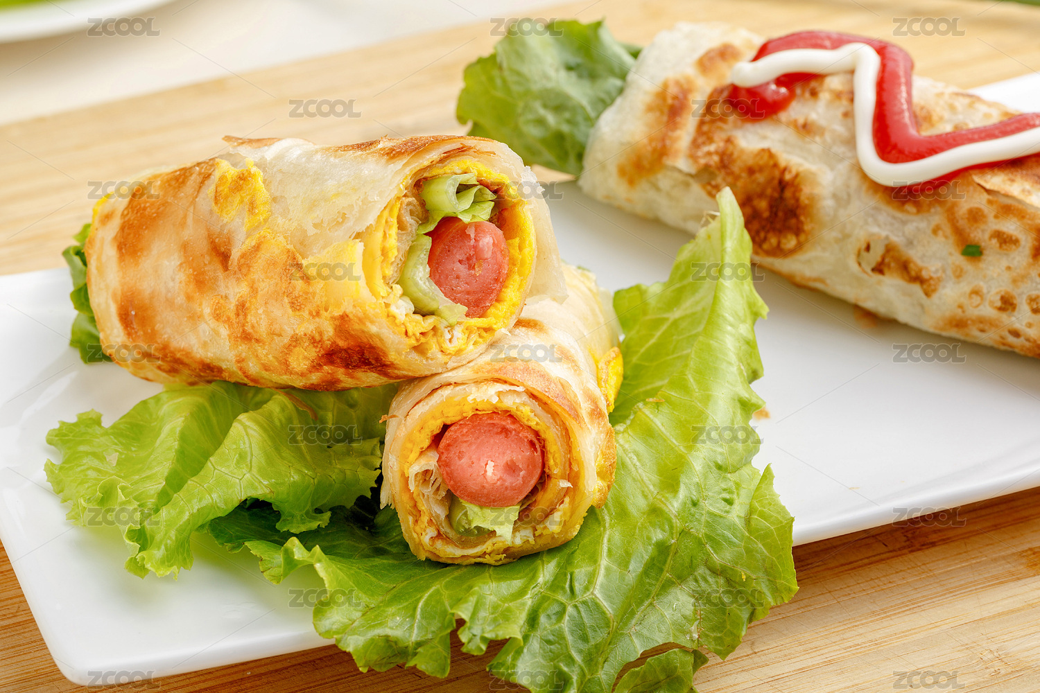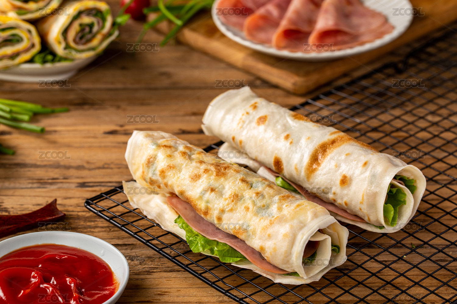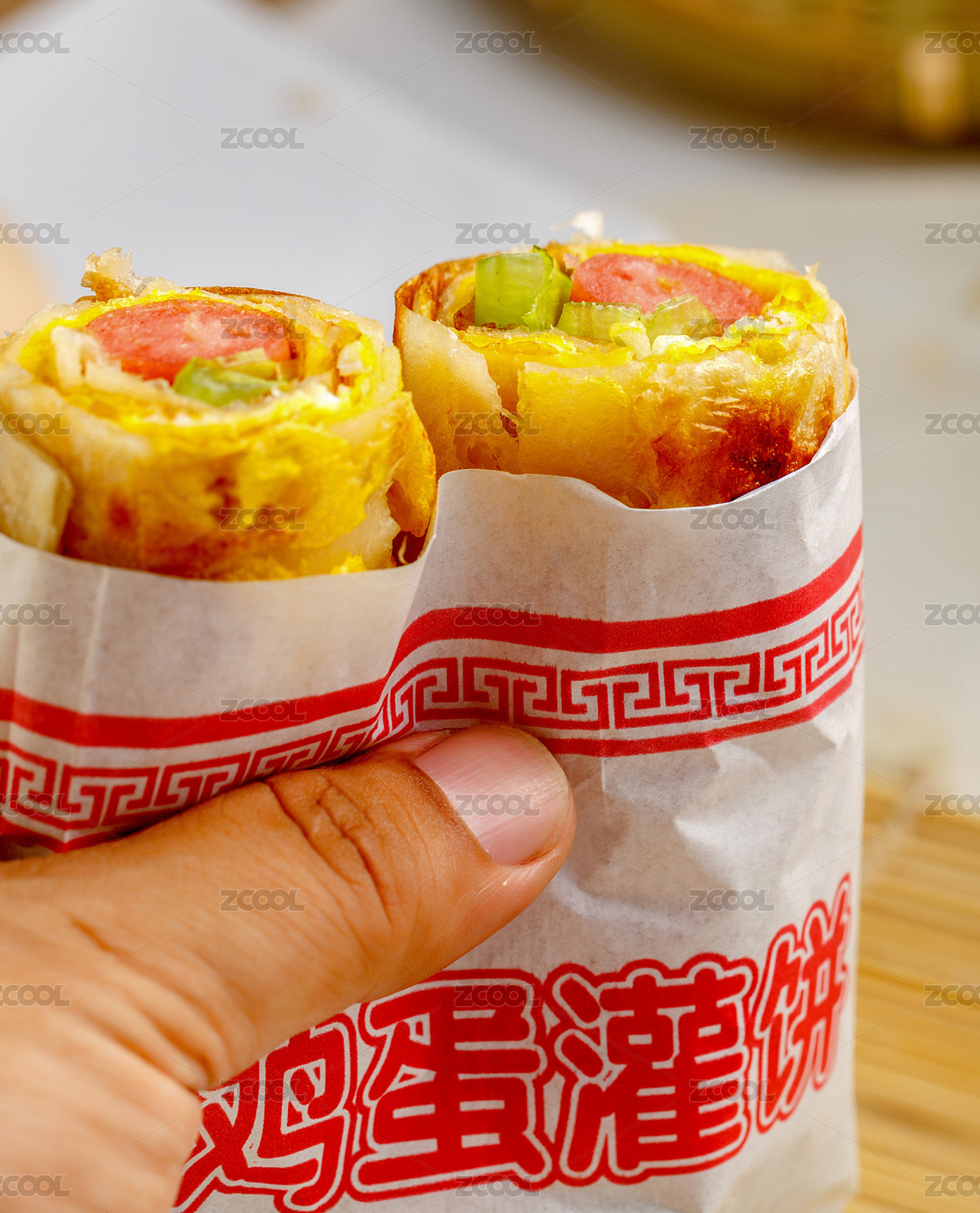 木板背景上的傳統(tǒng)美食小吃雞蛋灌餅