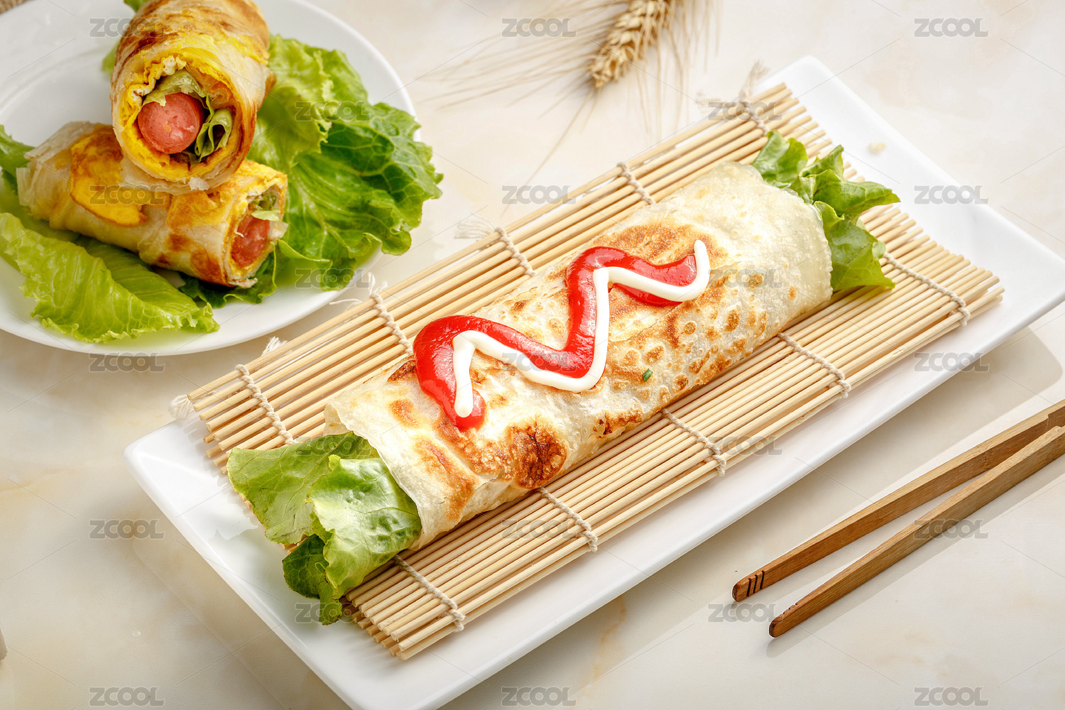 木板背景上小吃美食原味雞蛋灌餅