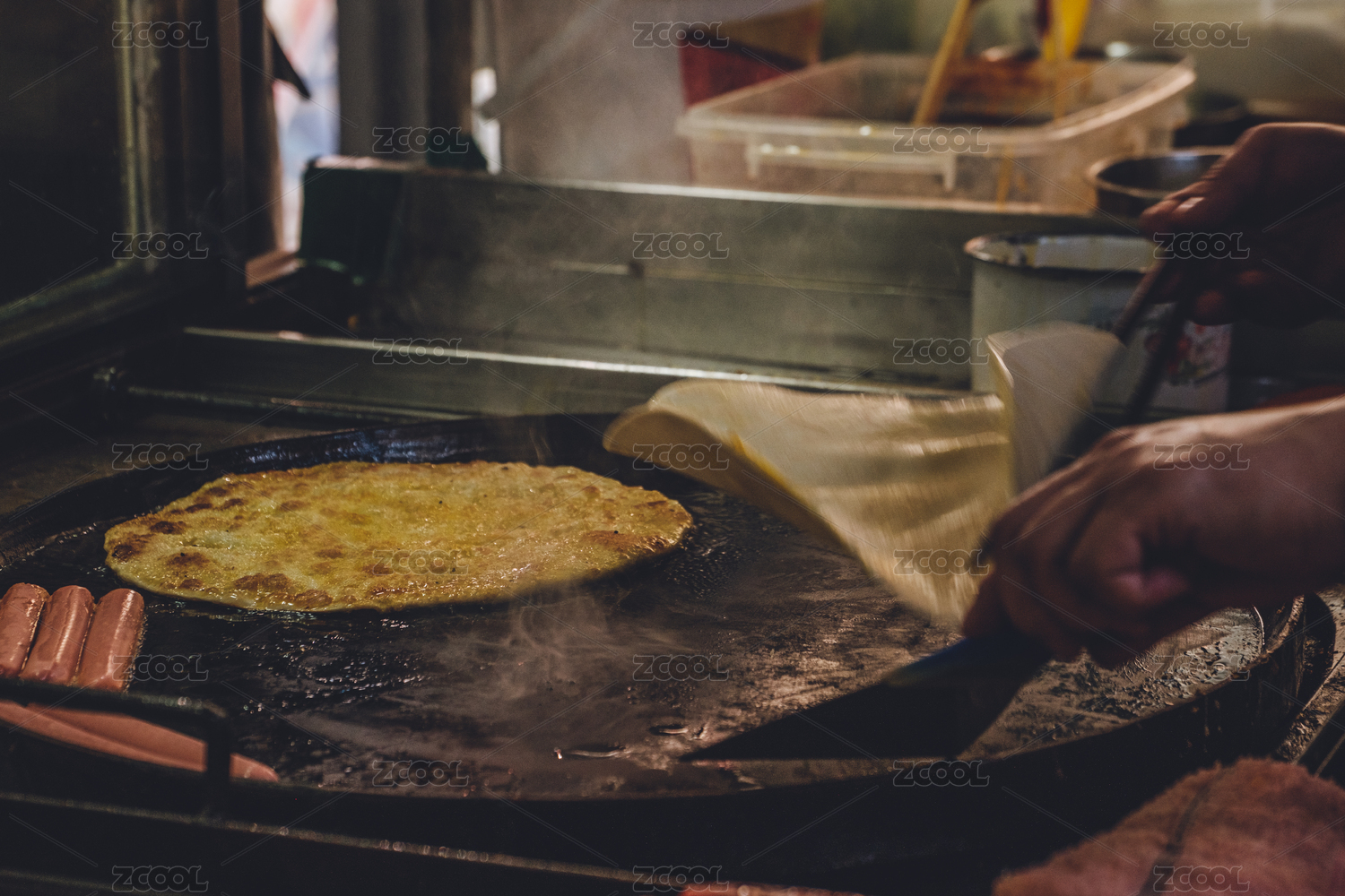 木板背景上正在煎制的雞蛋灌餅