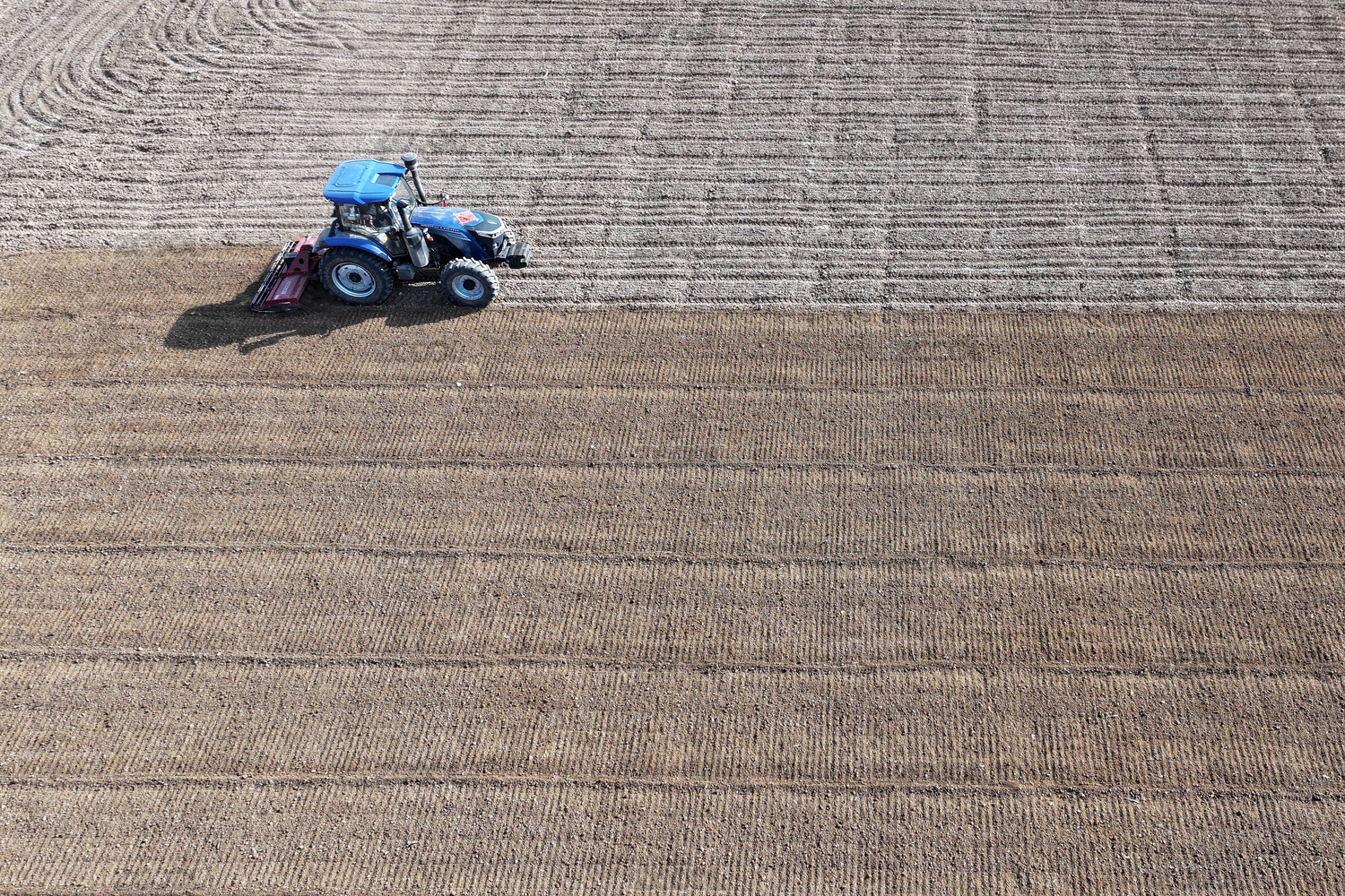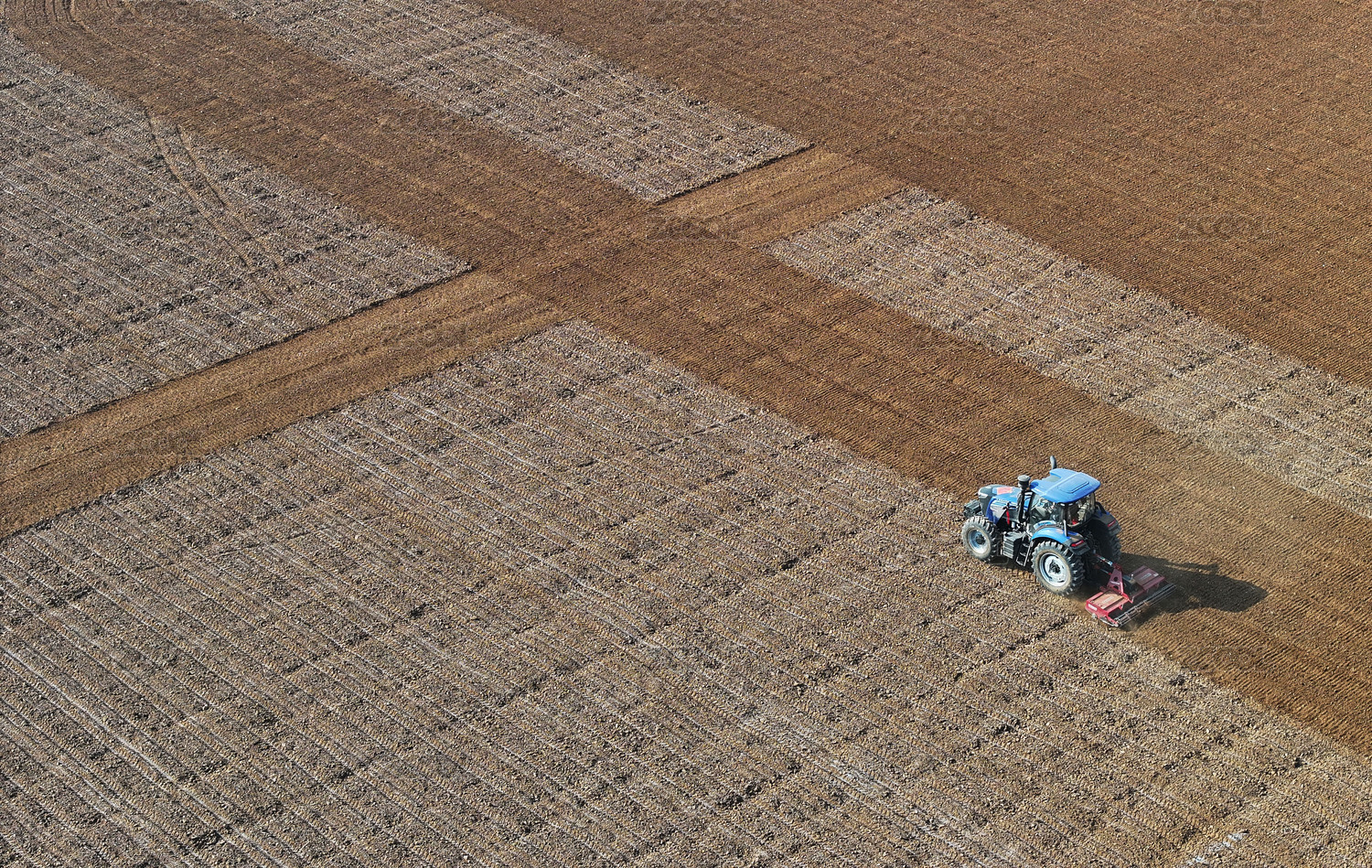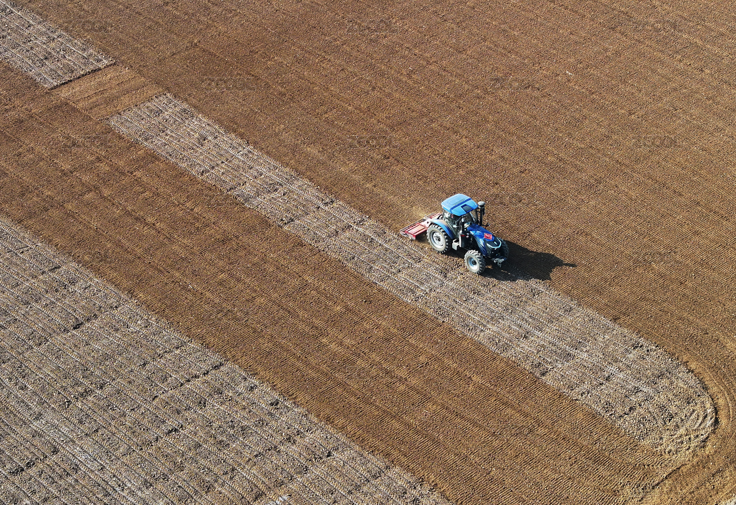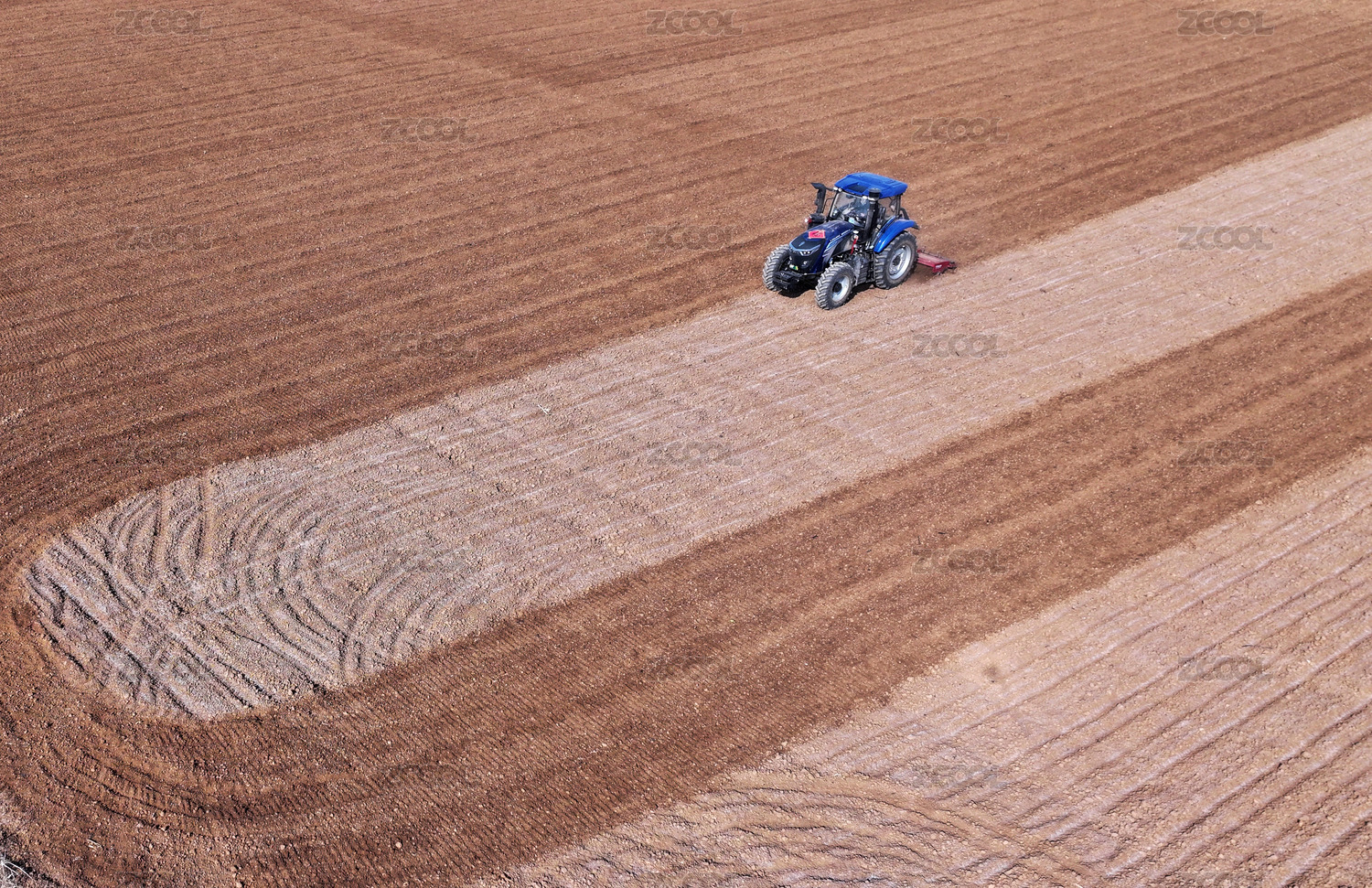 農(nóng)田中作業(yè)的藍(lán)色拖拉機(jī)