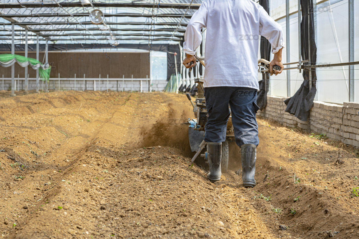標(biāo)準(zhǔn)農(nóng)業(yè)大棚內(nèi)工人在用農(nóng)機(jī)起壟
