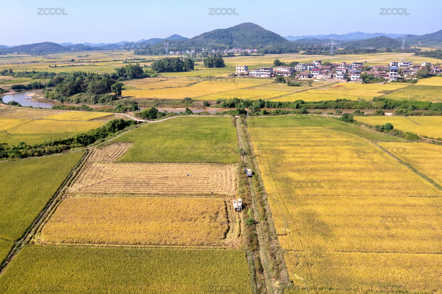 中國(guó)夏季農(nóng)村農(nóng)機(jī)與堆積的麥稈