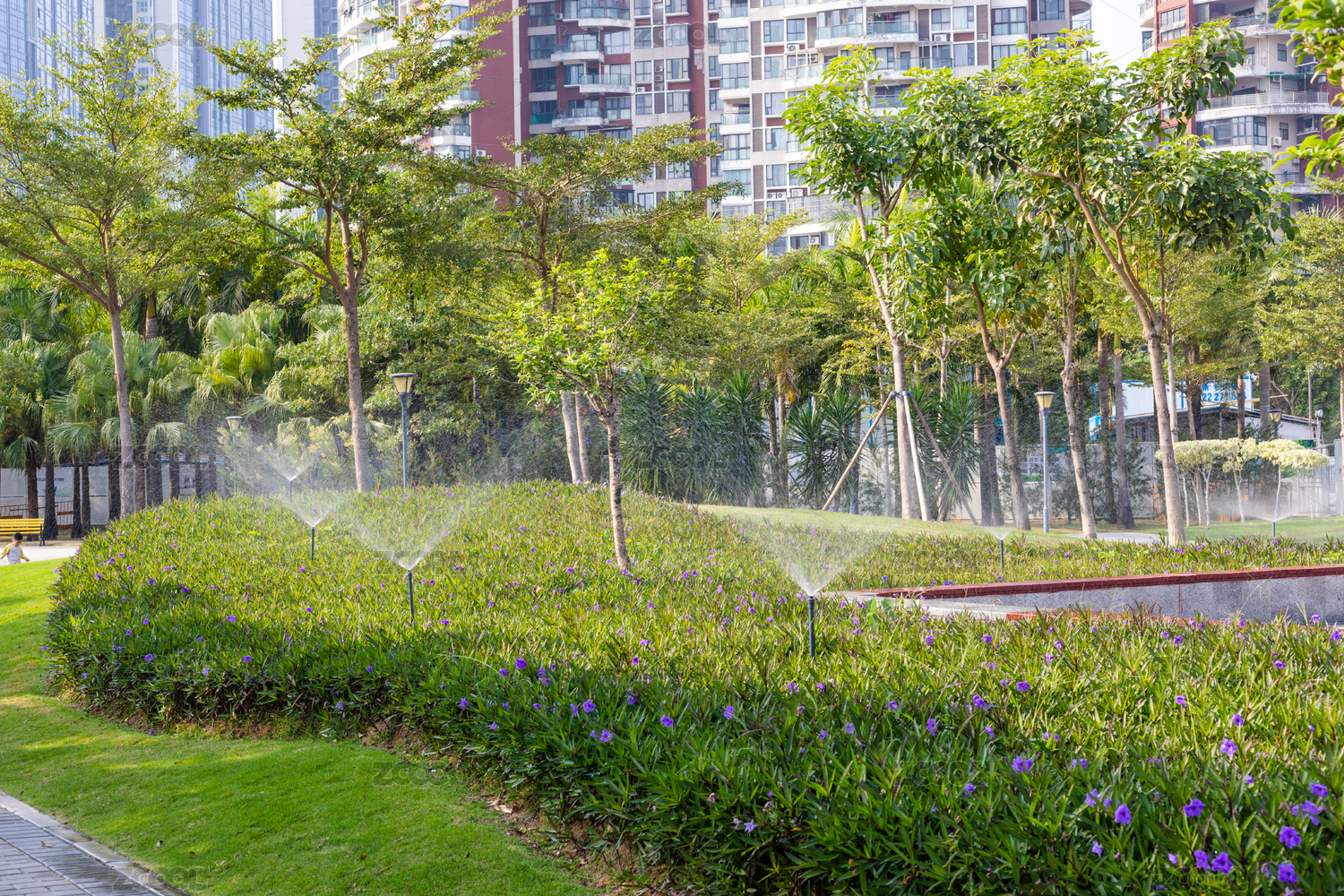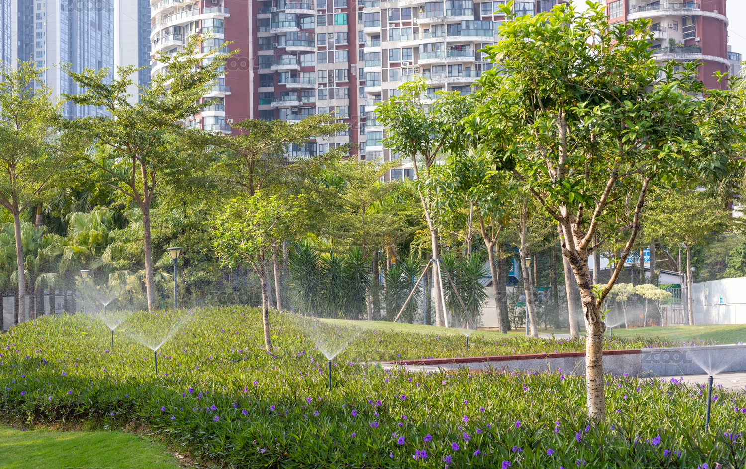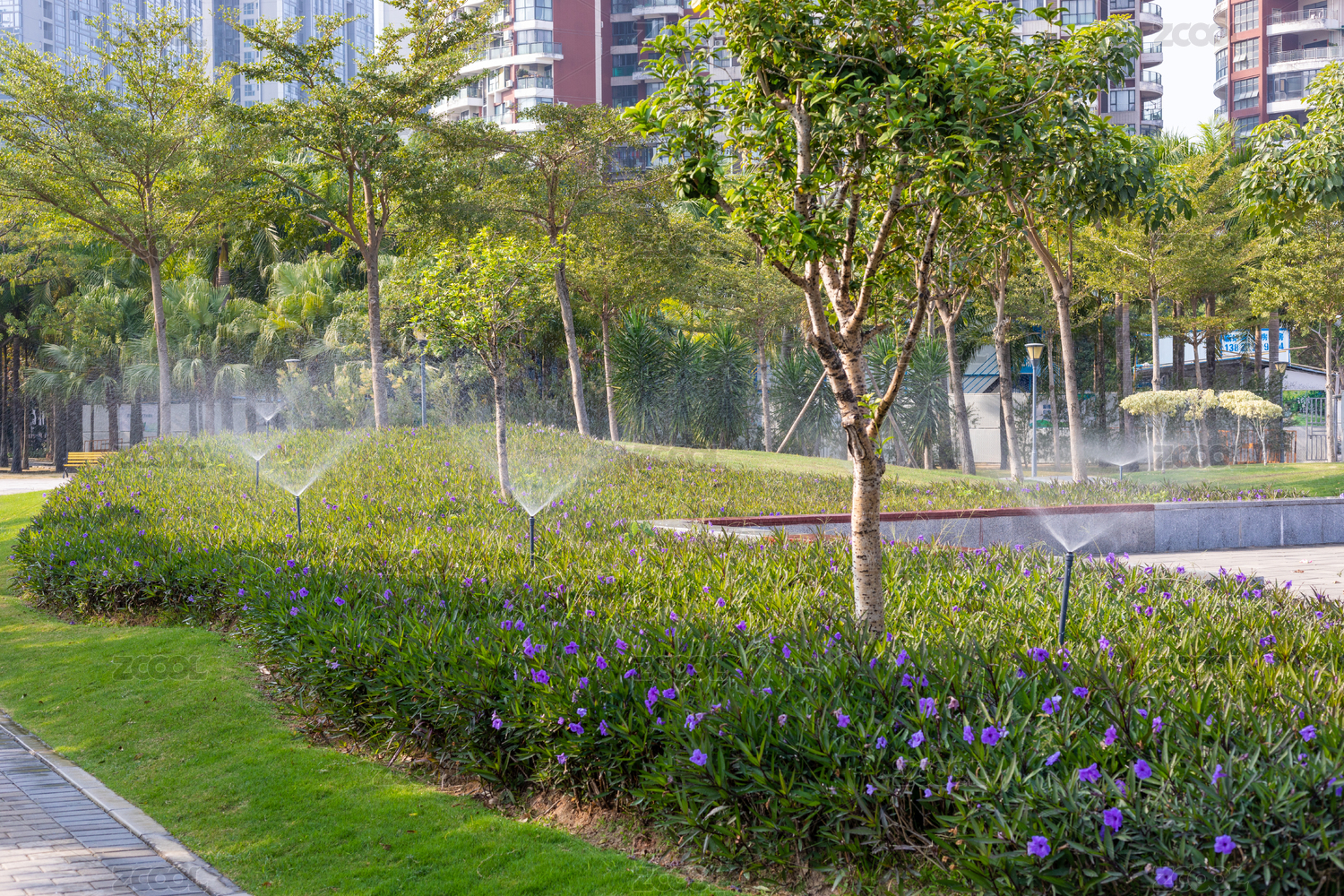 白天公園里的灑水裝置在澆灌樹(shù)木花草