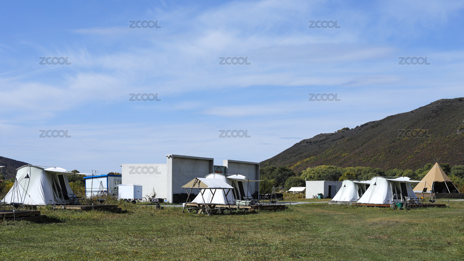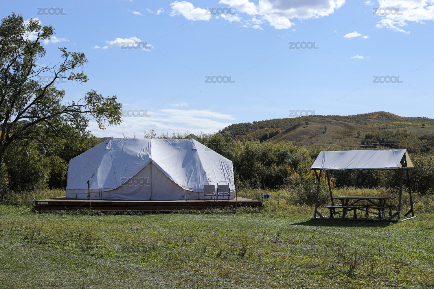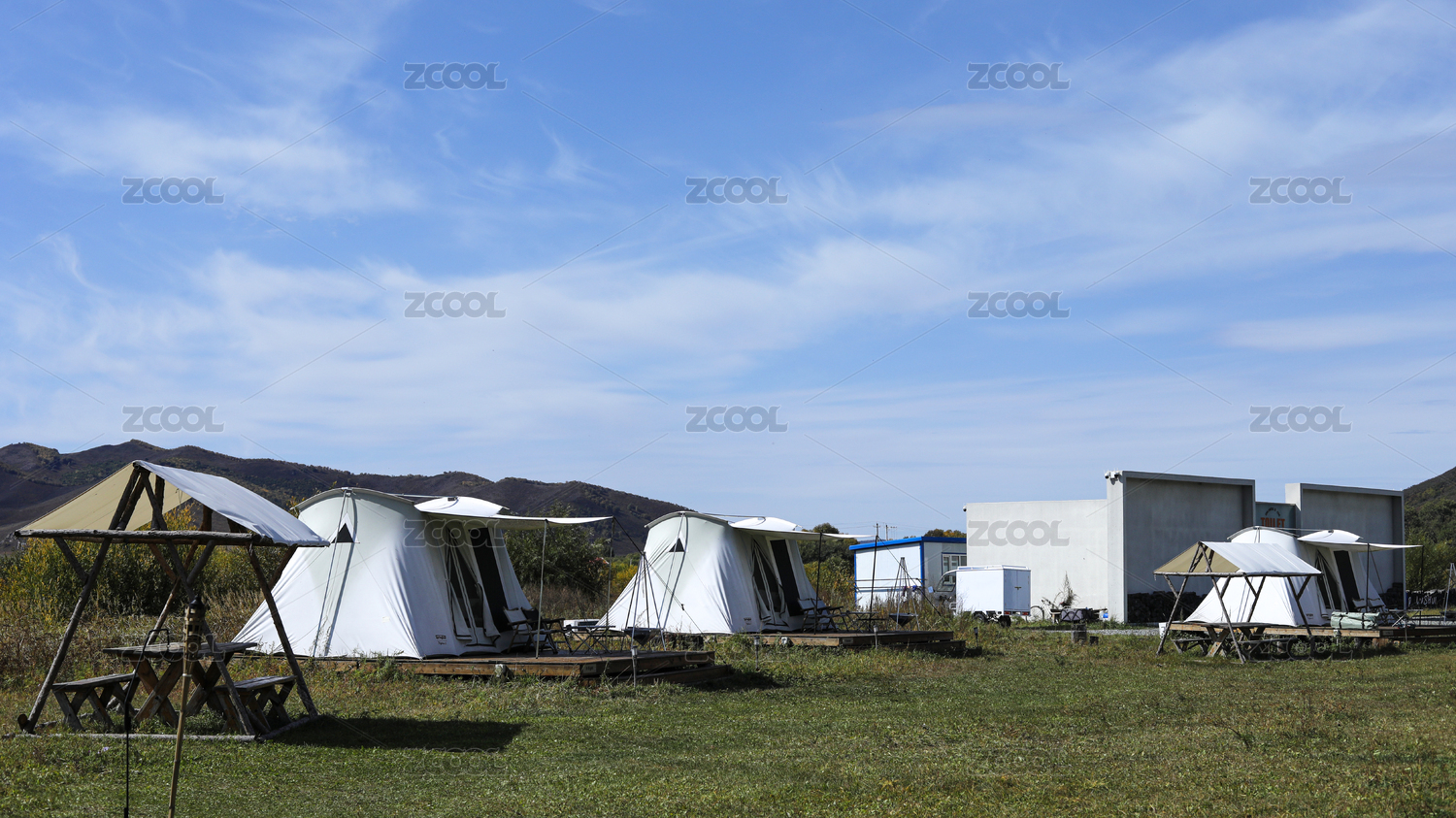 藍天白云下風(fēng)景優(yōu)美的戶外露營地和帳篷