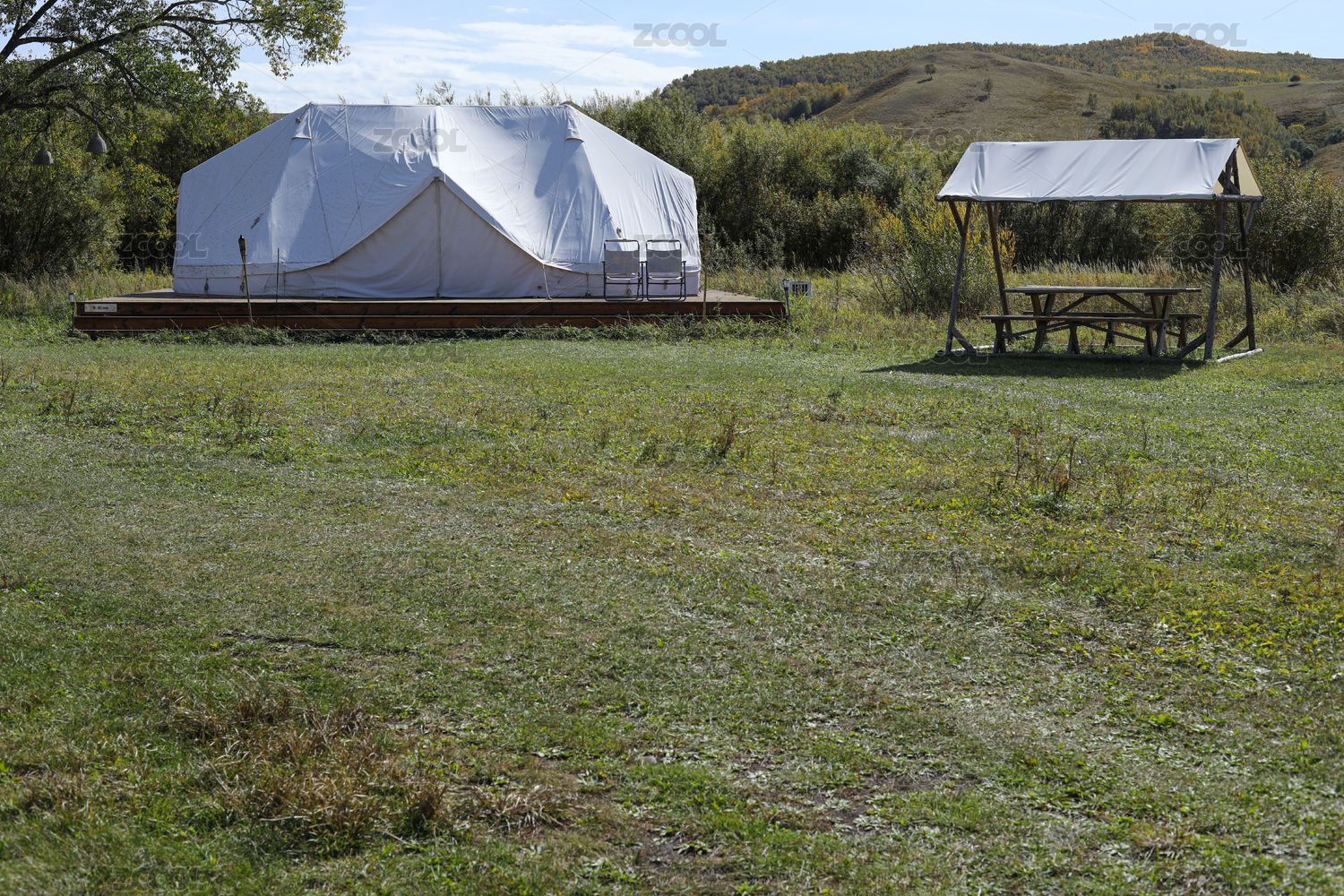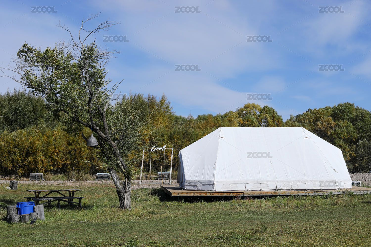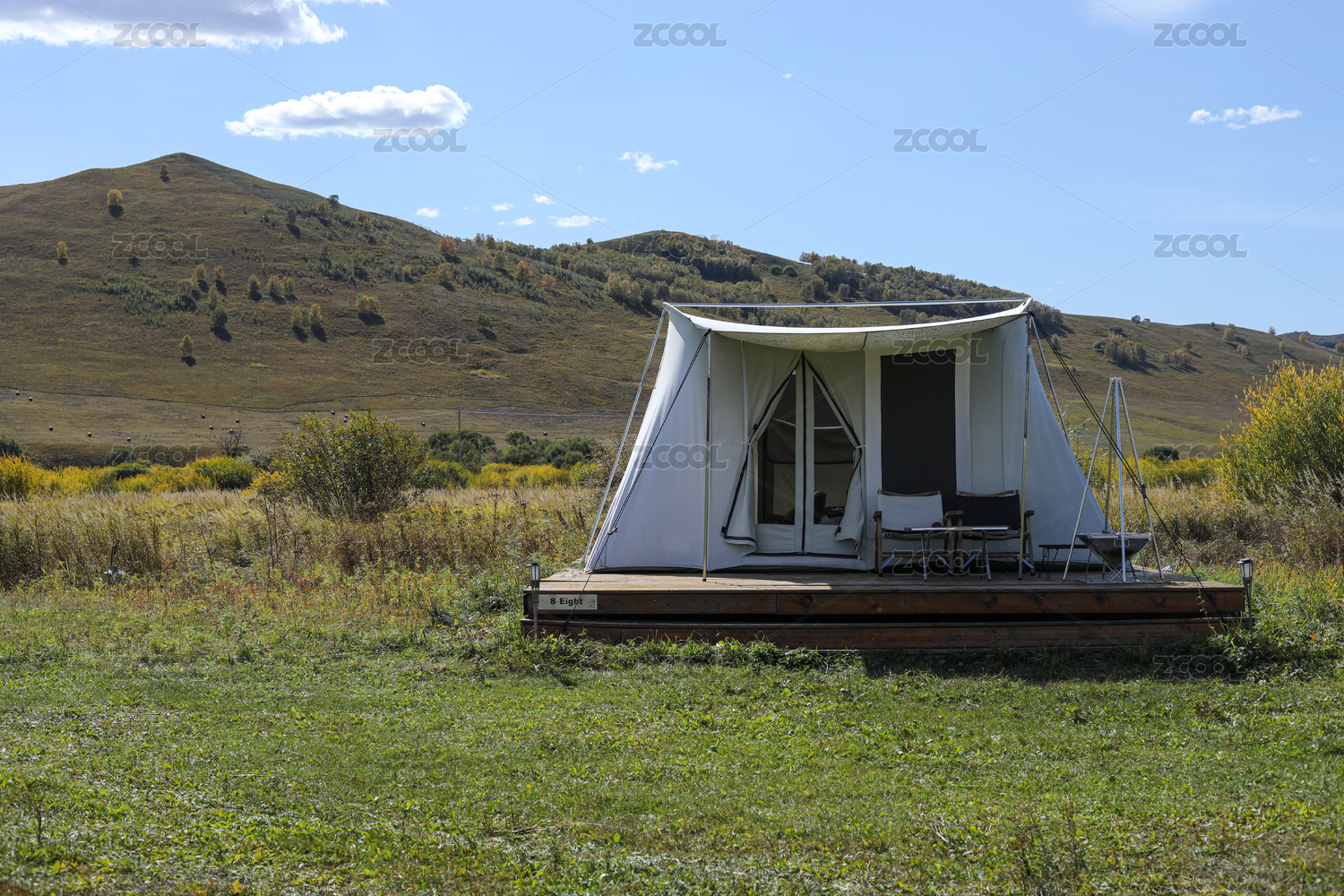 藍天白云下風(fēng)景優(yōu)美的戶外露營地和帳篷
