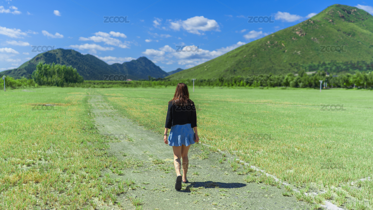 亞洲女人旅行途中走在風(fēng)景優(yōu)美的大山中