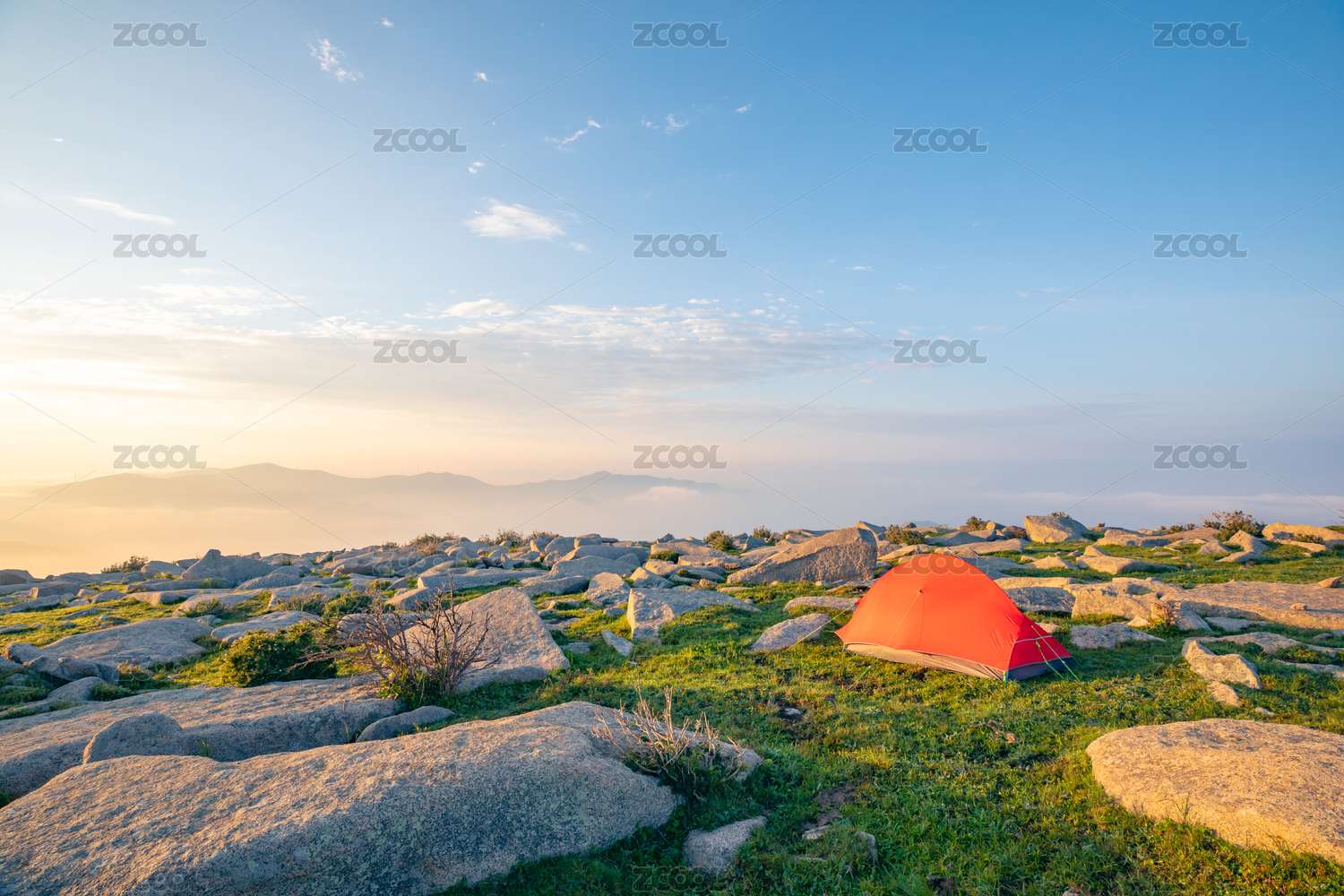 露營(yíng)在山頂?shù)募t色帳篷非常美麗