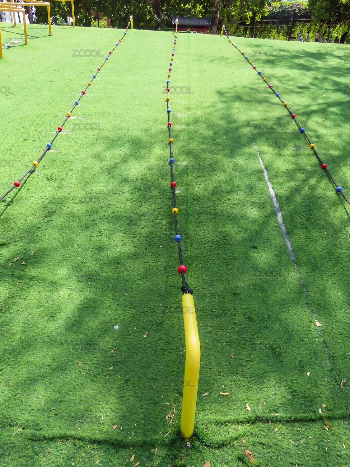 彩色繩索與黃色柱子的草坪訓(xùn)練場(chǎng)