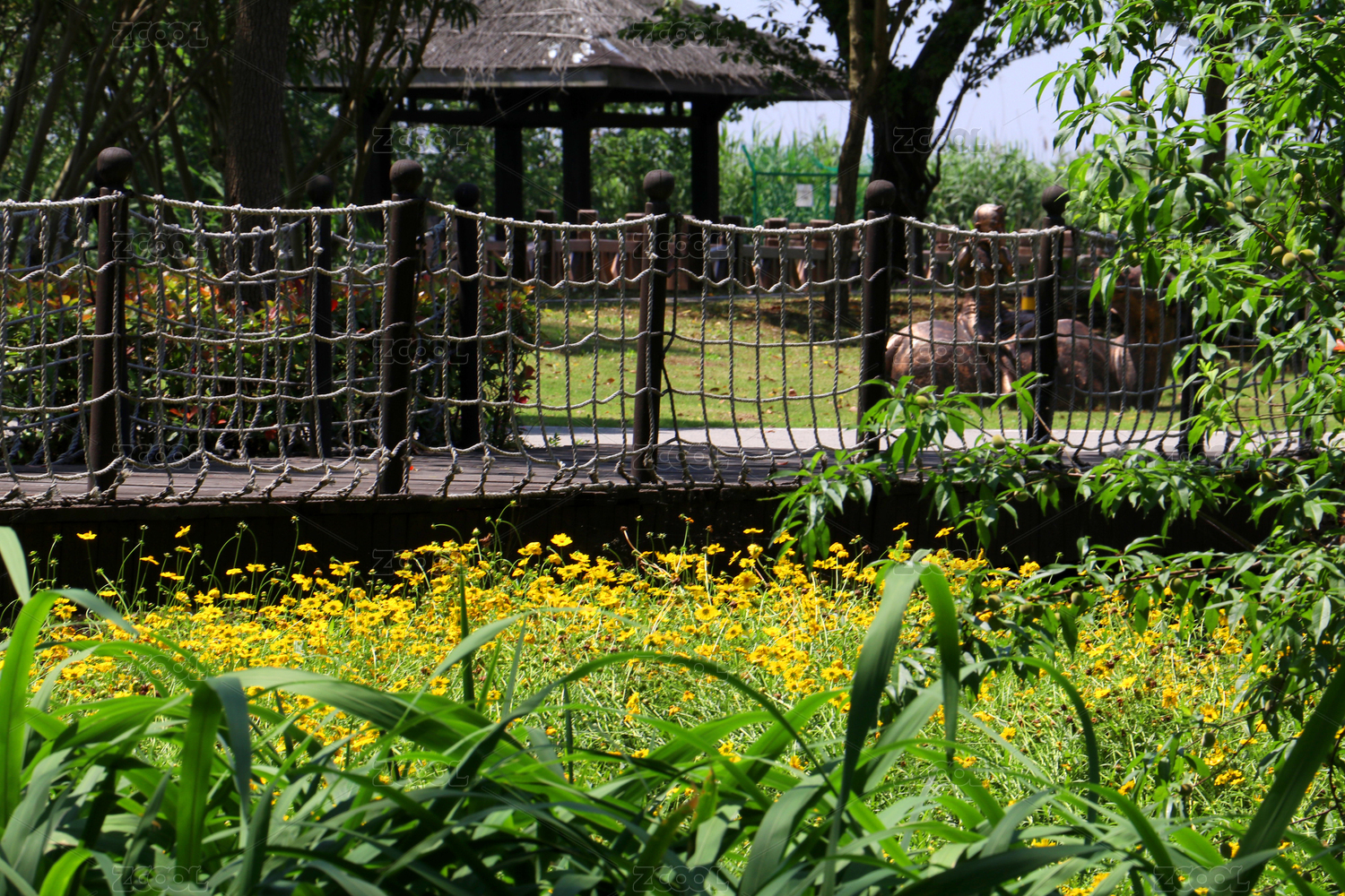 被繩索圍欄分割的茅屋與黃花