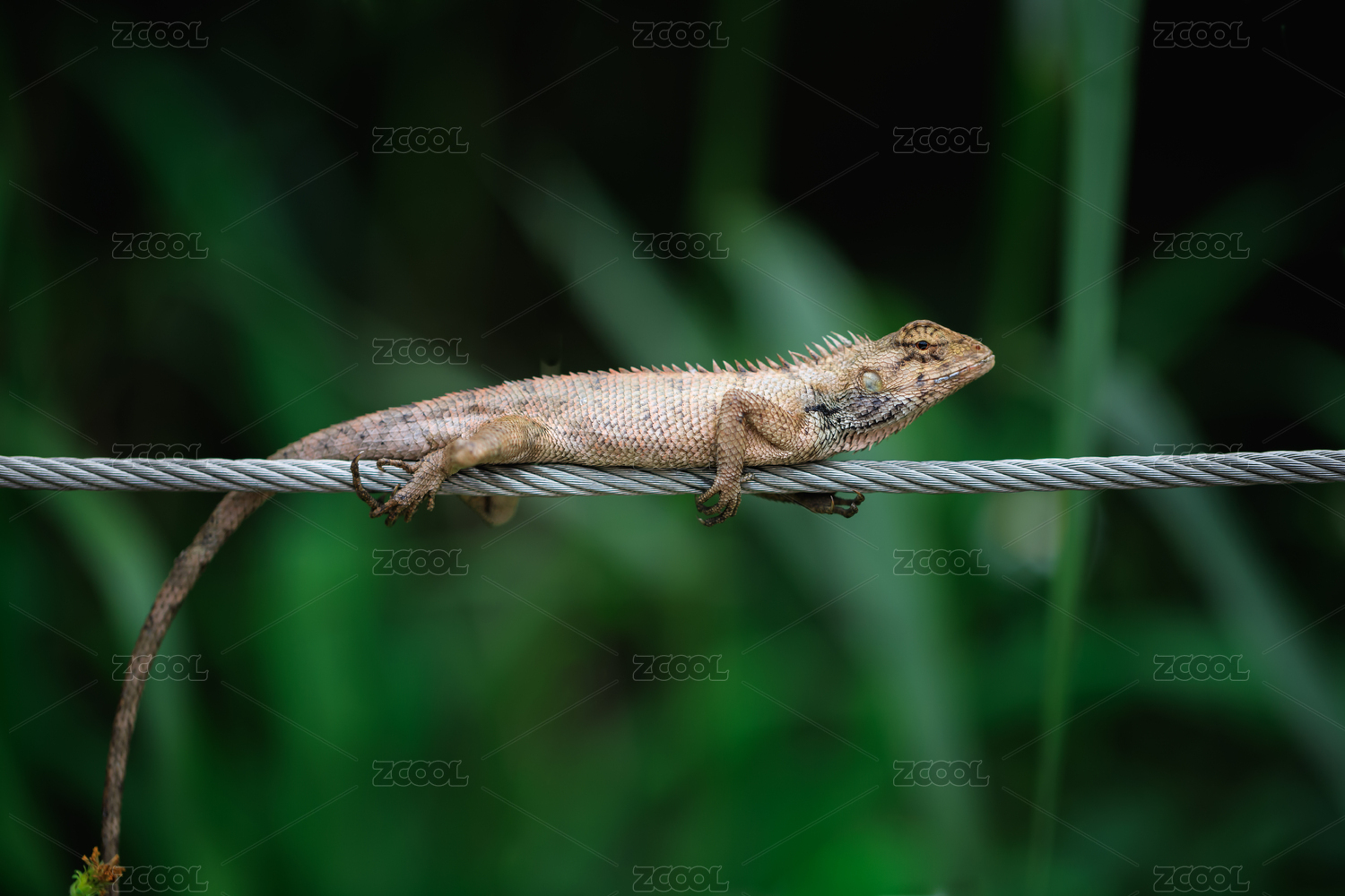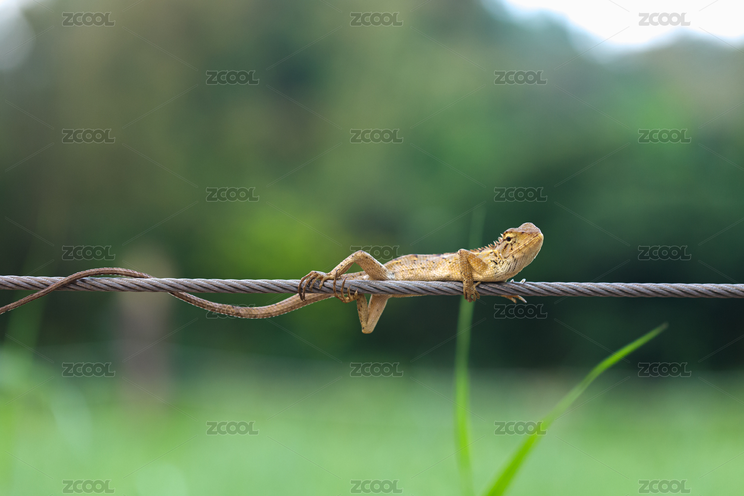金屬繩索上趴著的一條蜥蜴