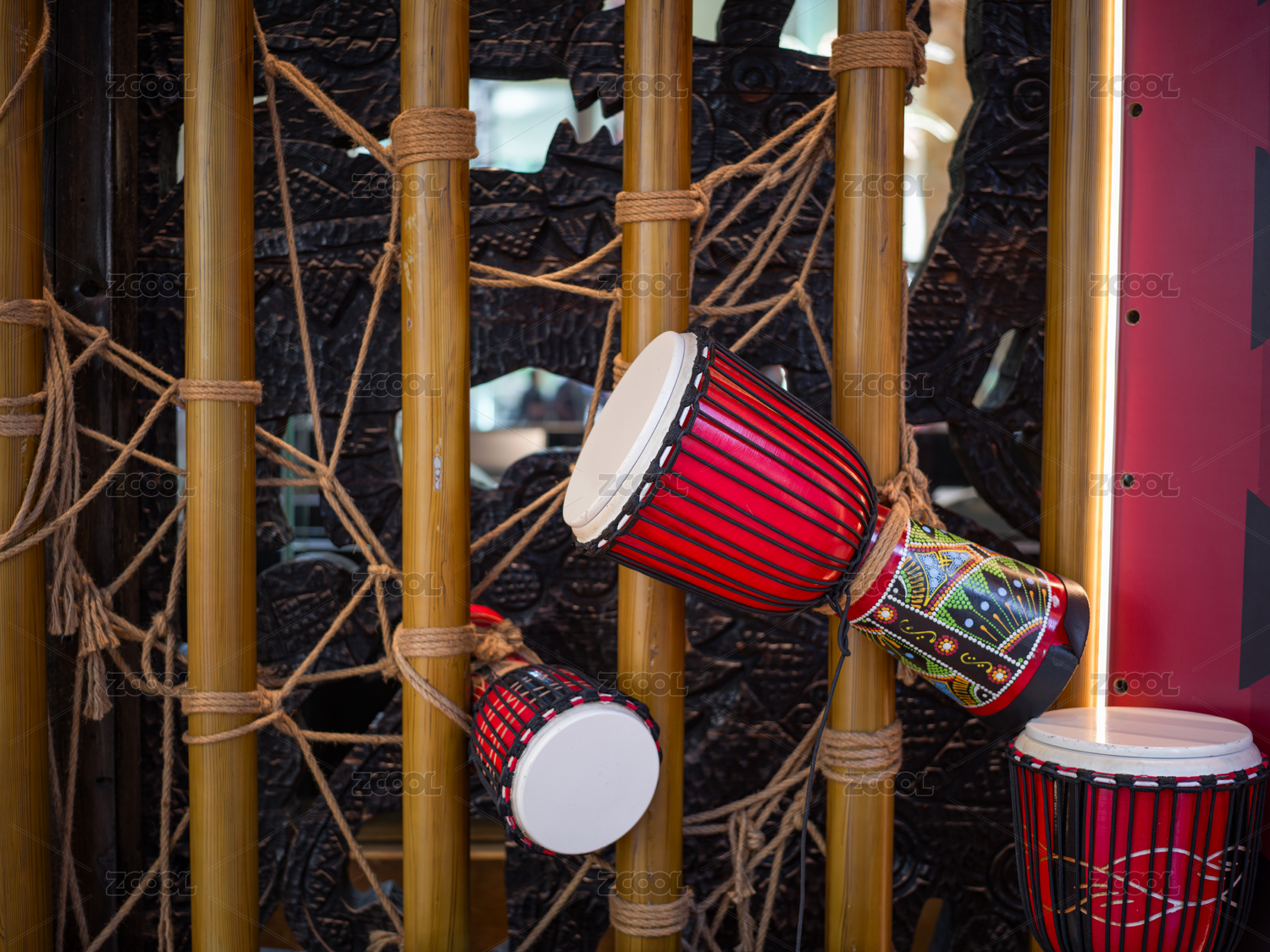 竹桿繩索間的裝飾手鼓