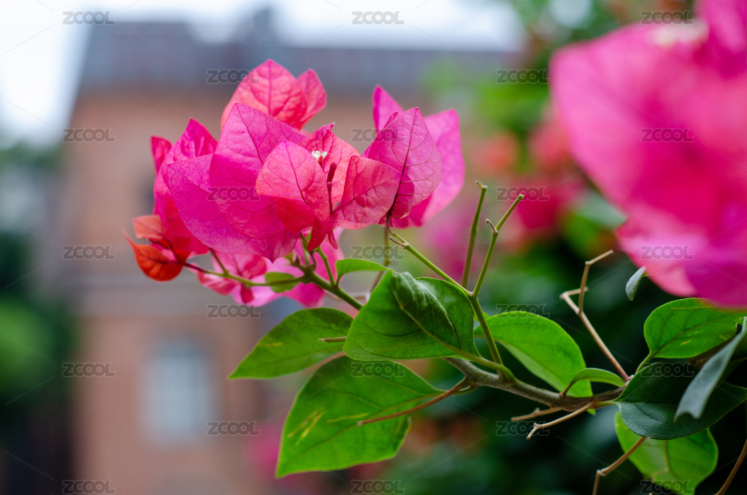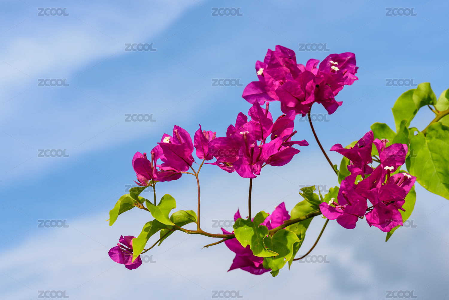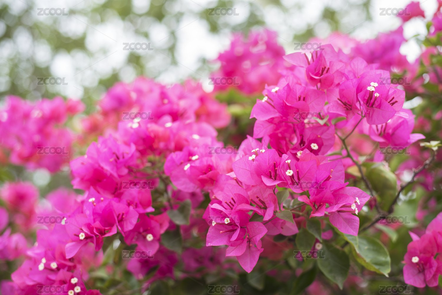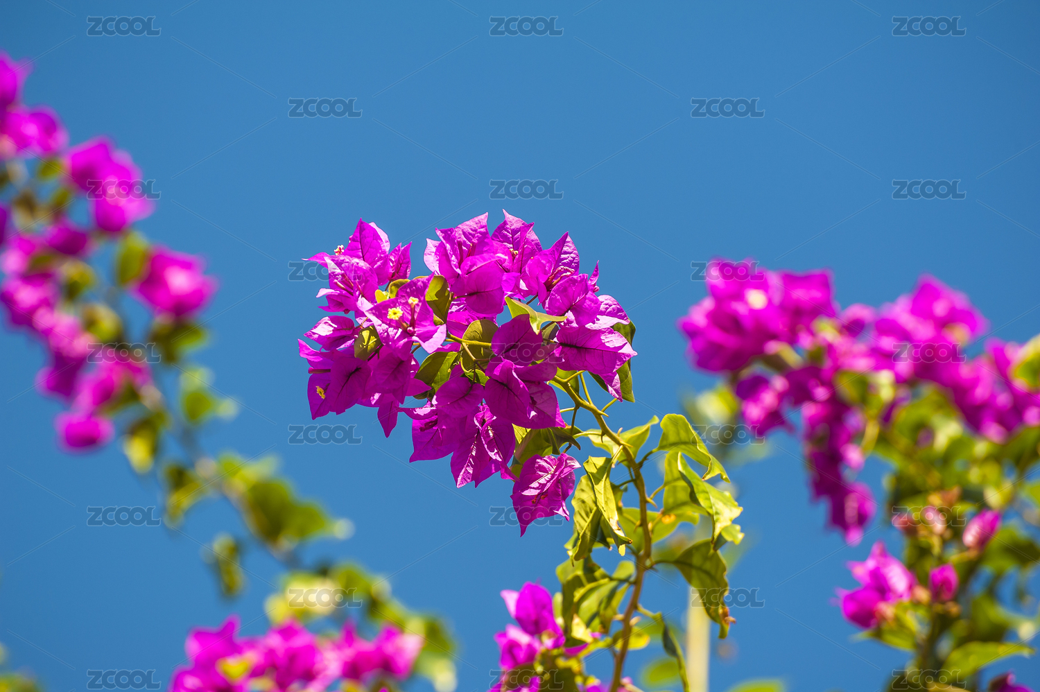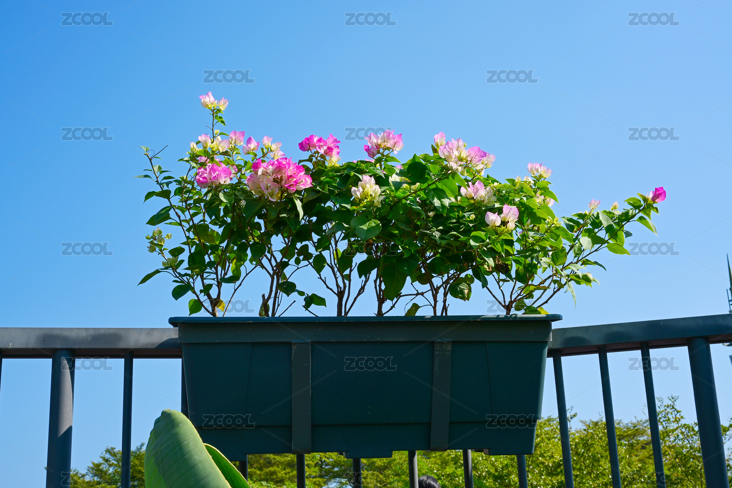 藍(lán)天下欄桿上盛放的粉色三角梅花卉盆栽