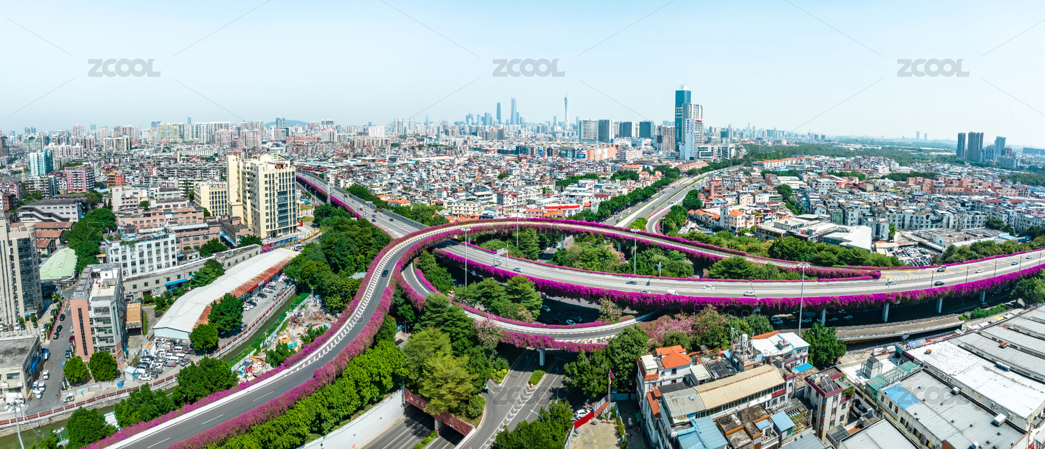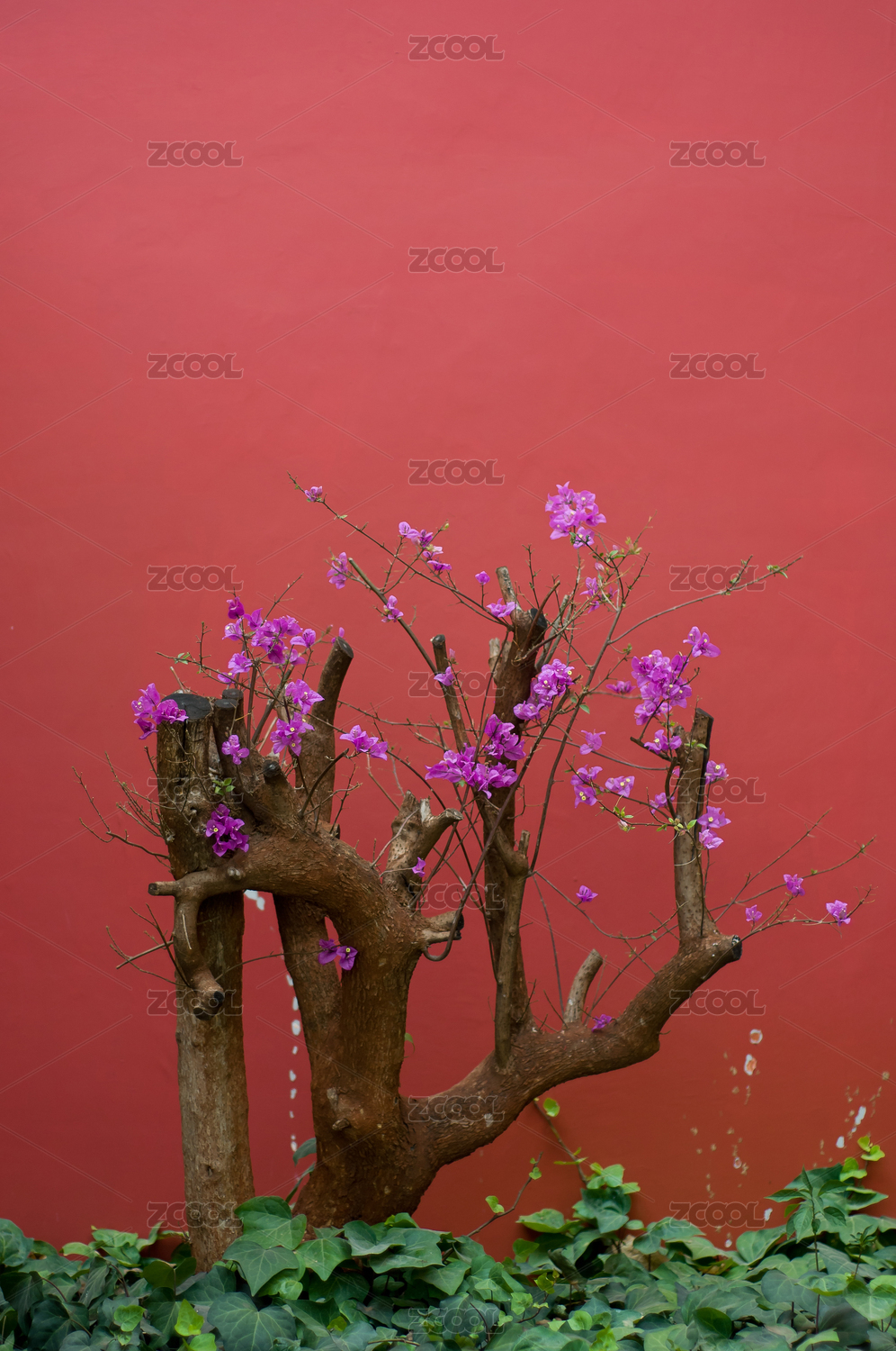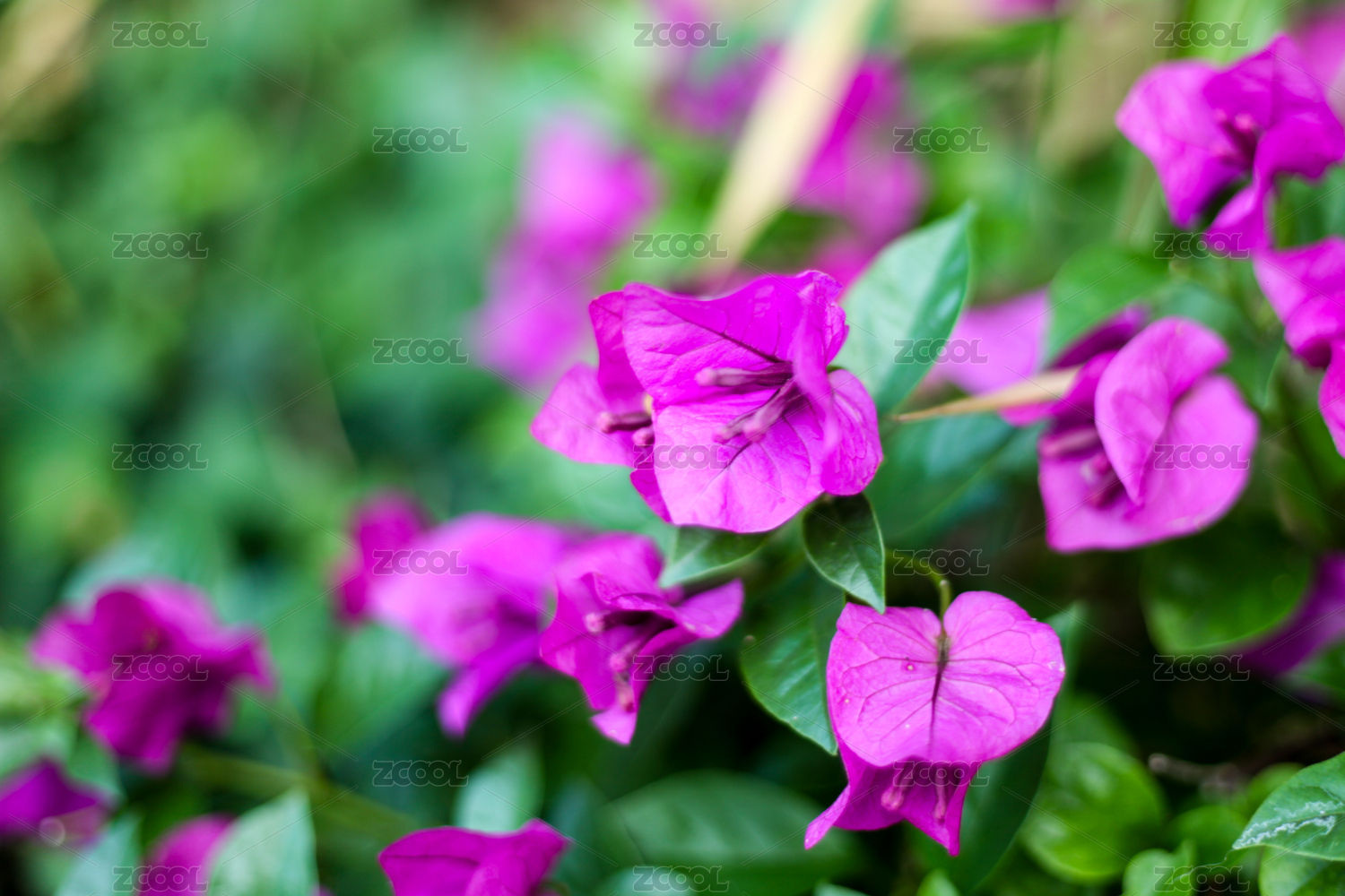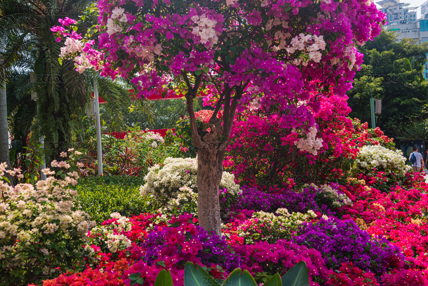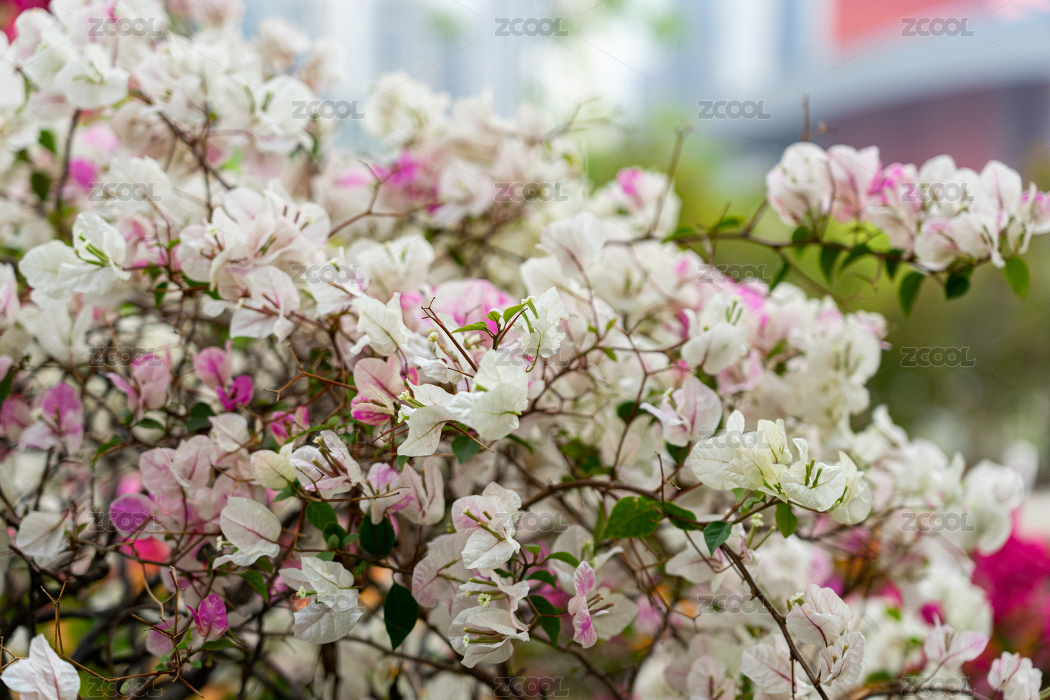藍(lán)天下欄桿上盛放的粉色三角梅花卉盆栽