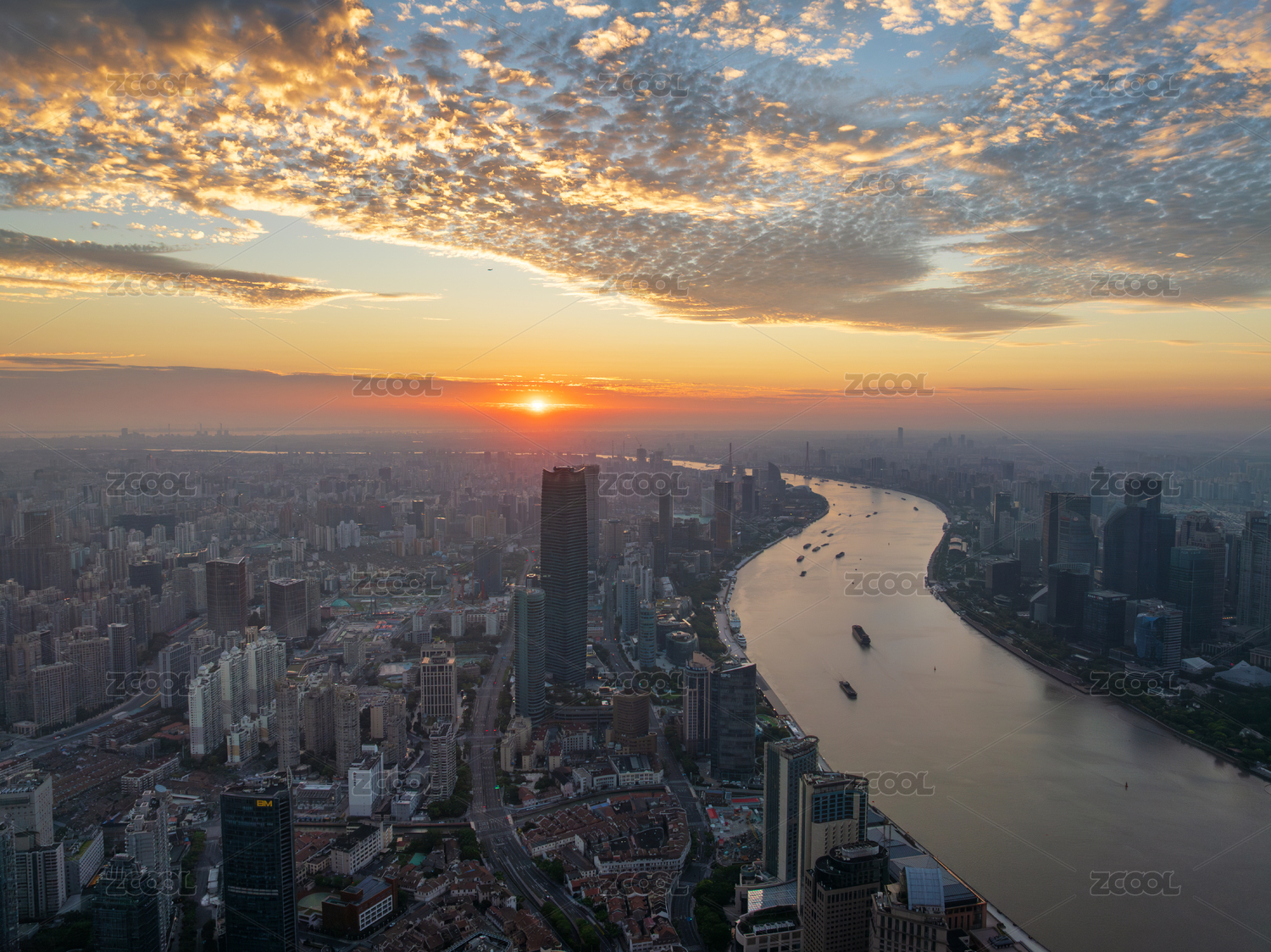 日出時分的上海白玉蘭觀景臺與黃浦江
