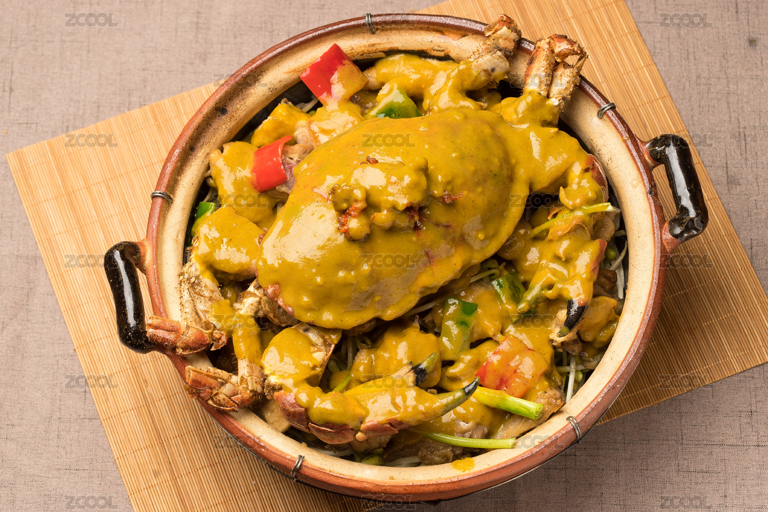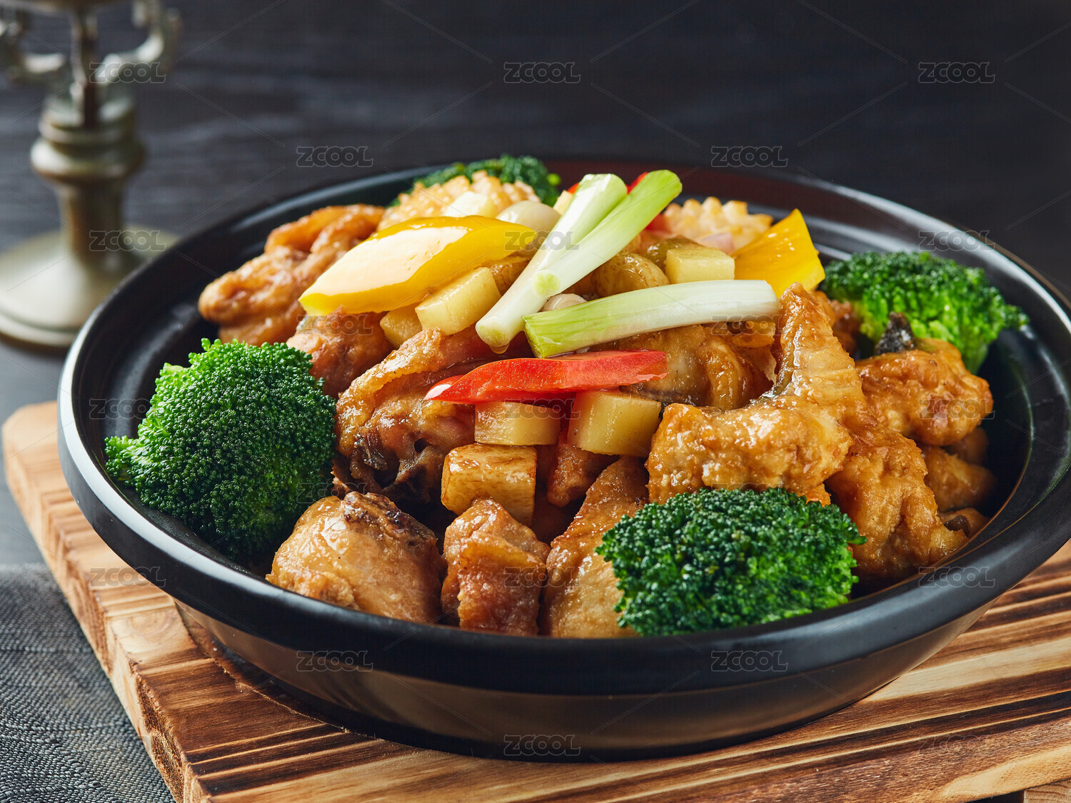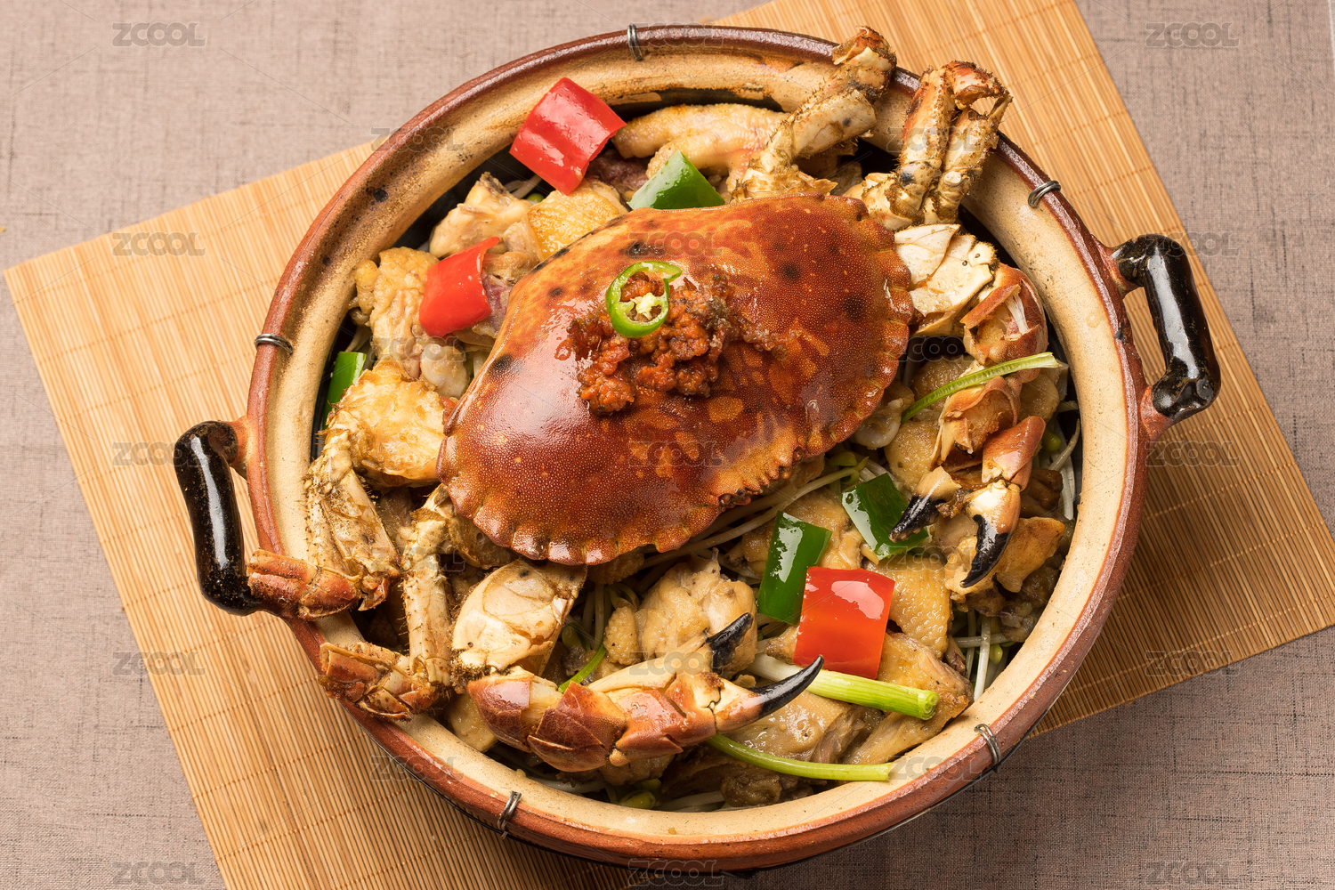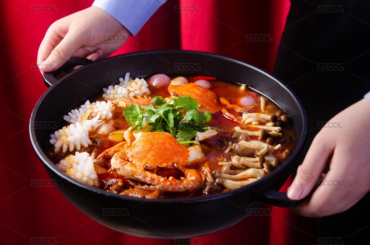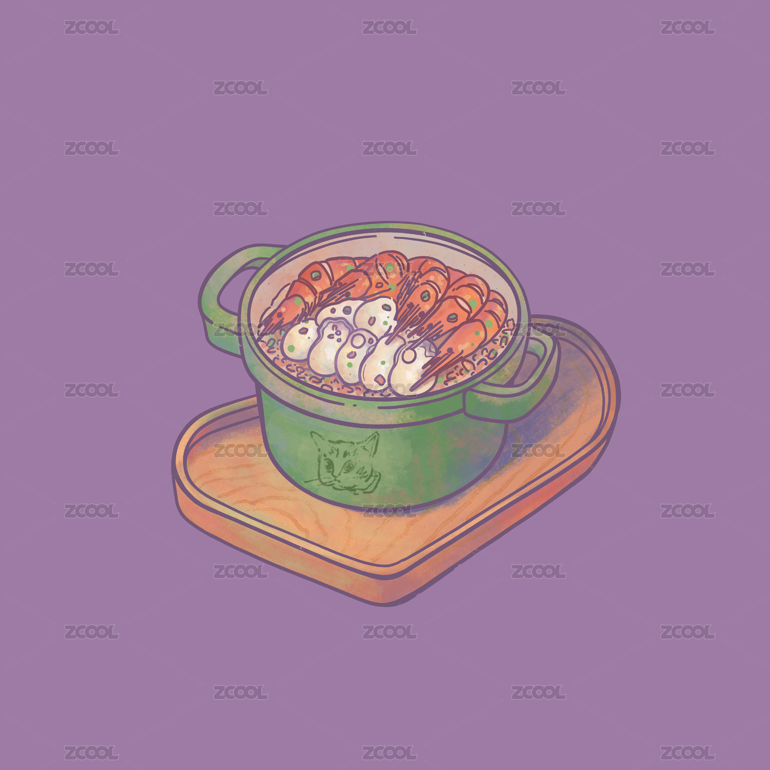 木板托盤(pán)上一鍋海鮮煲紫紅色背景