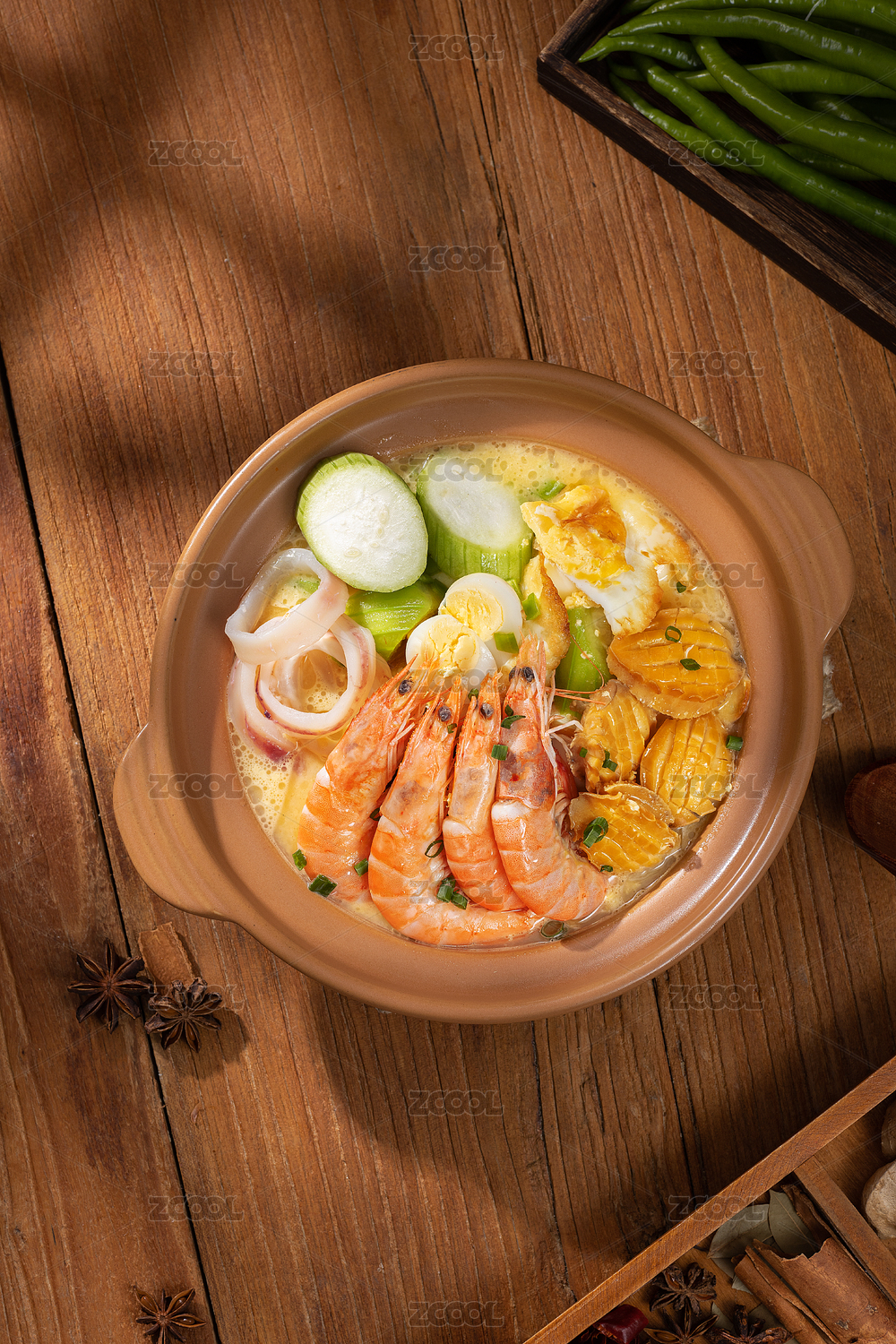 木桌上砂鍋里的絲瓜雞蛋湯海鮮煲