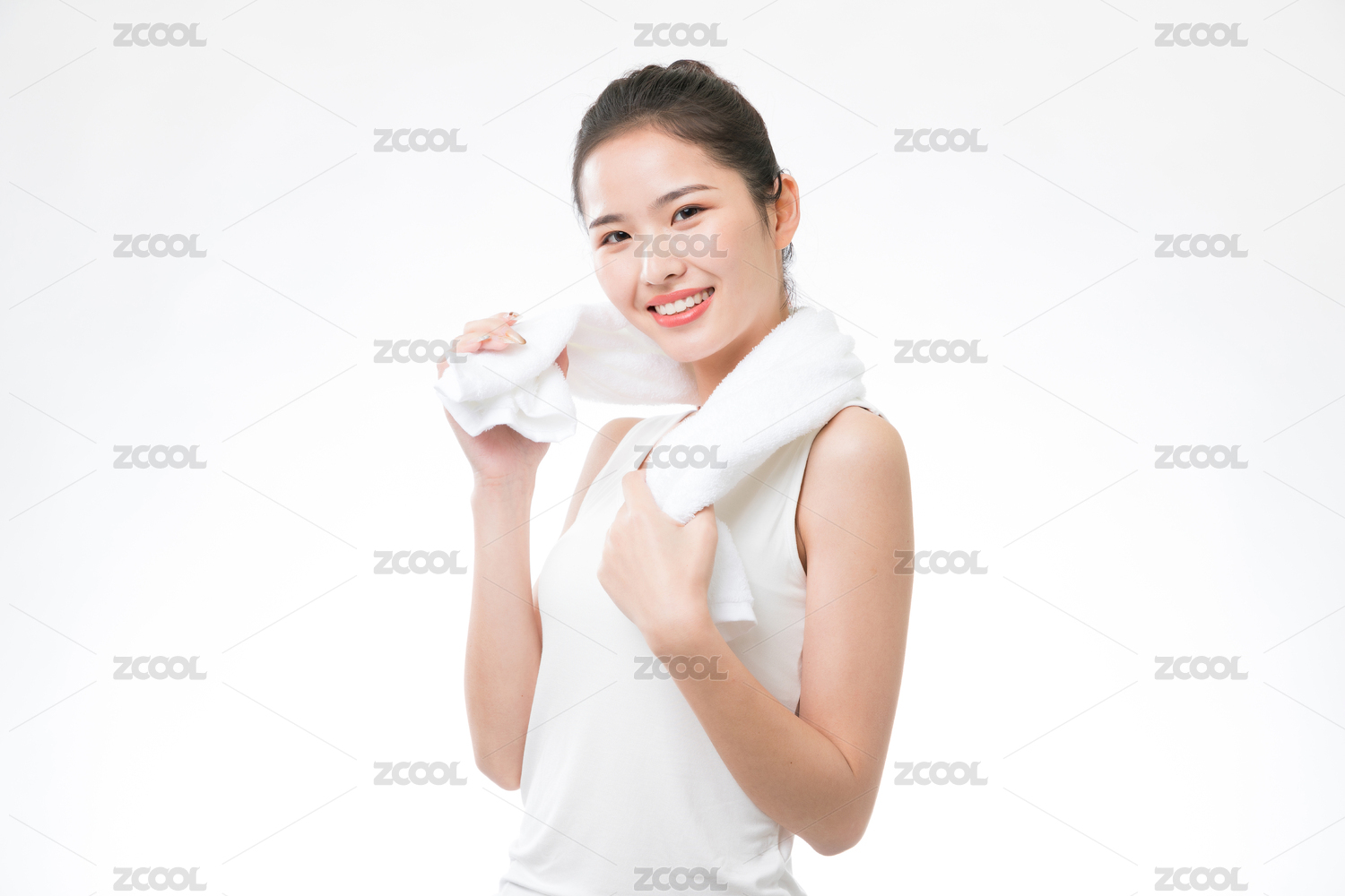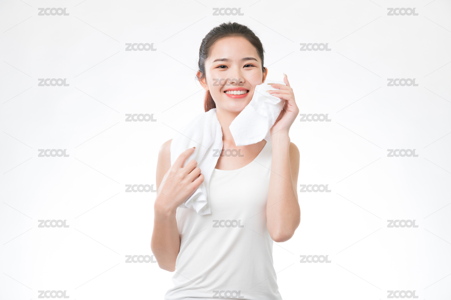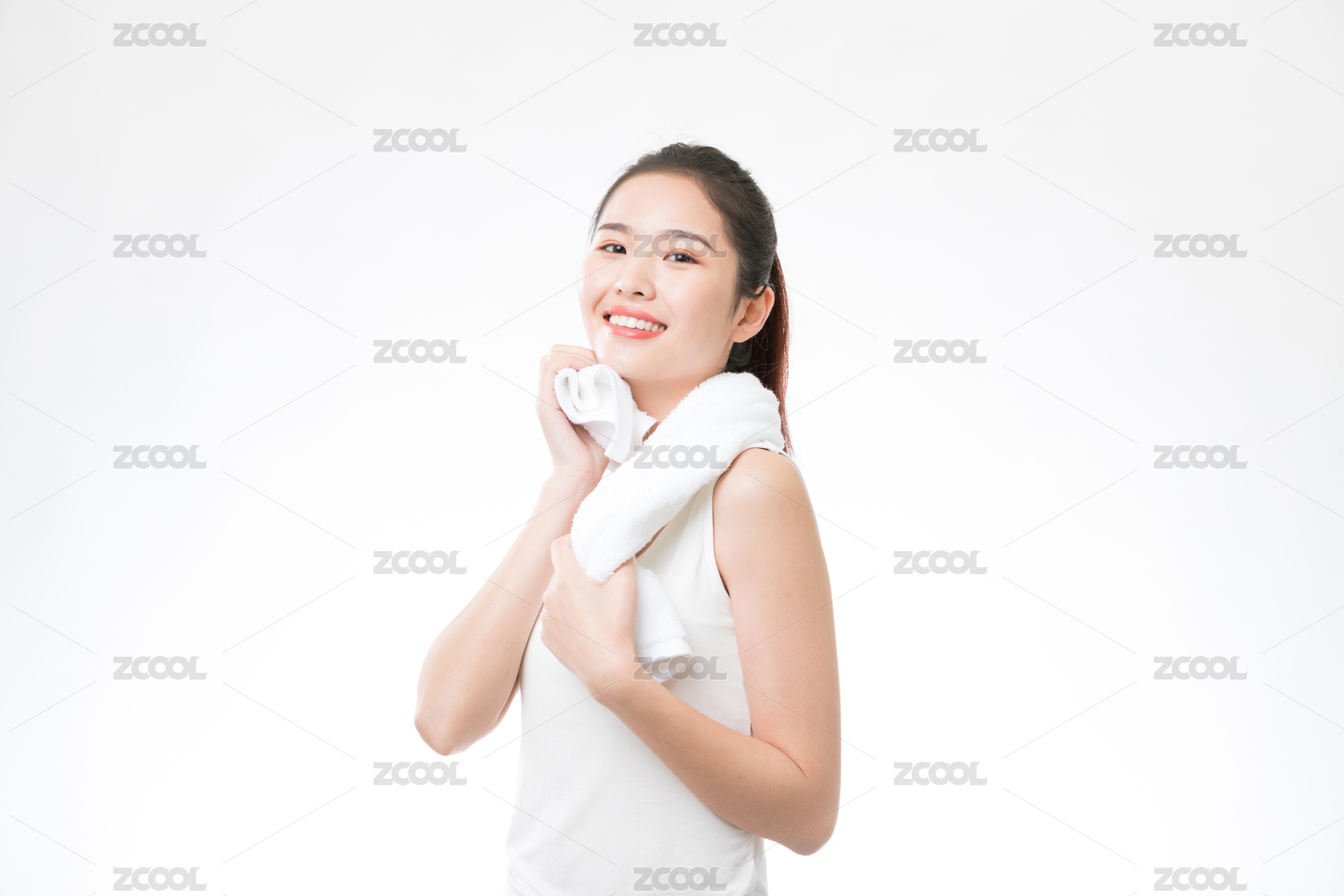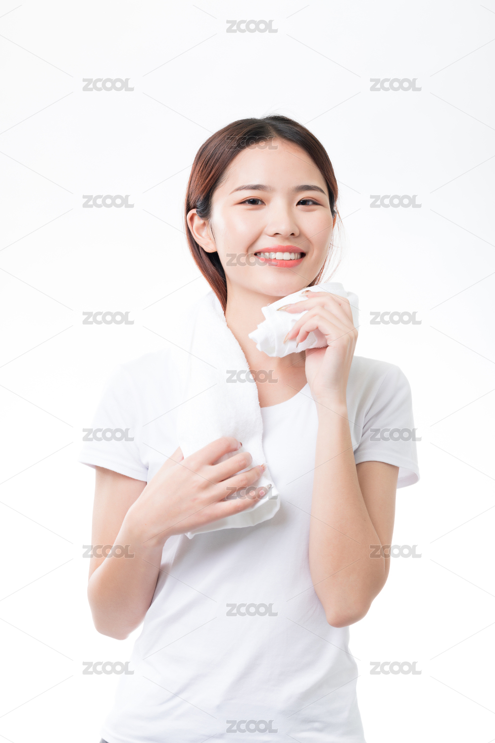 一位年輕的亞洲女性在白色背前景用毛巾擦汗