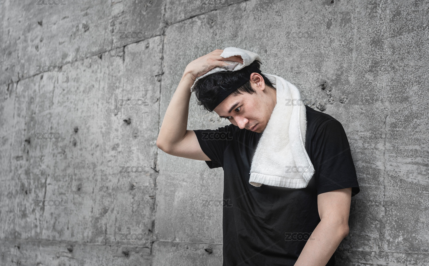 運動男子靠在墻邊用毛巾擦汗
