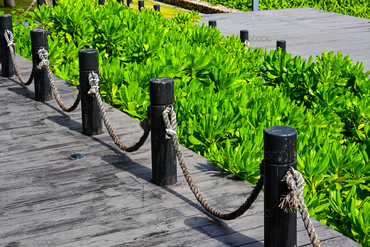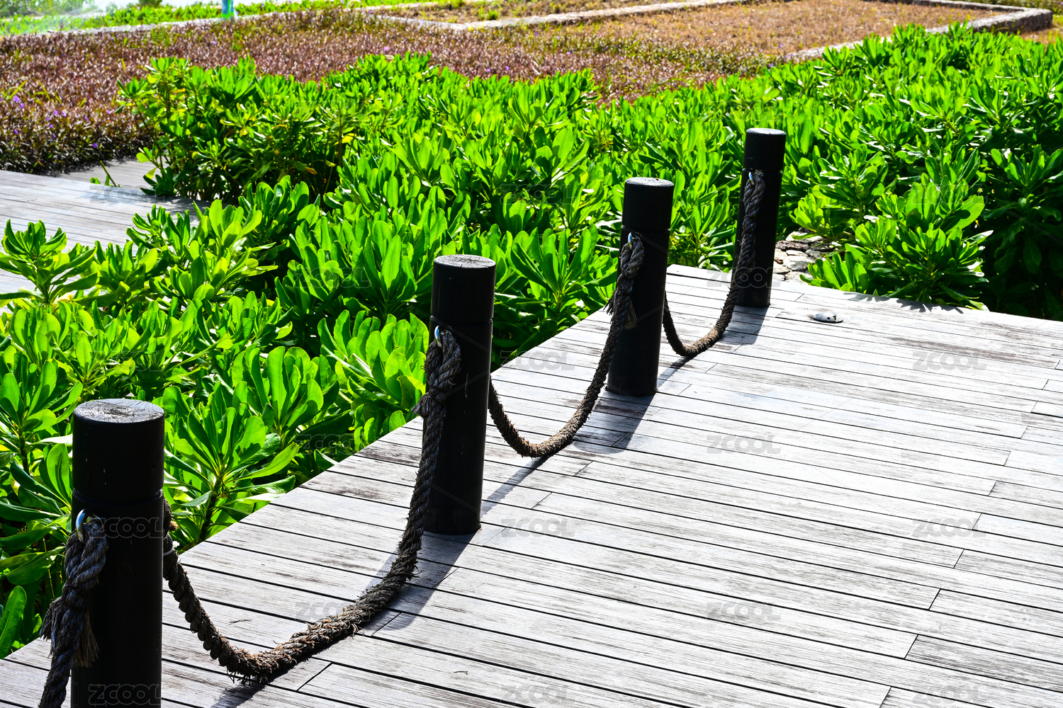 陽光下的木棧道與綠植圍欄景觀