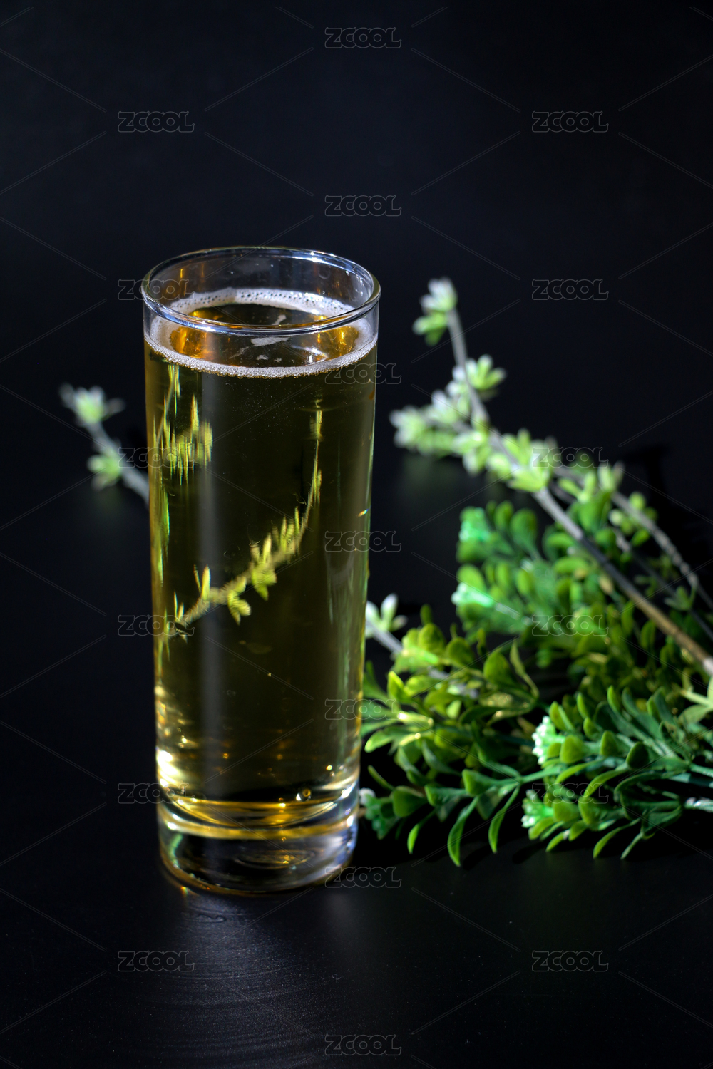 純黑色背景上倒?jié)M啤酒的玻璃杯及綠枝條
