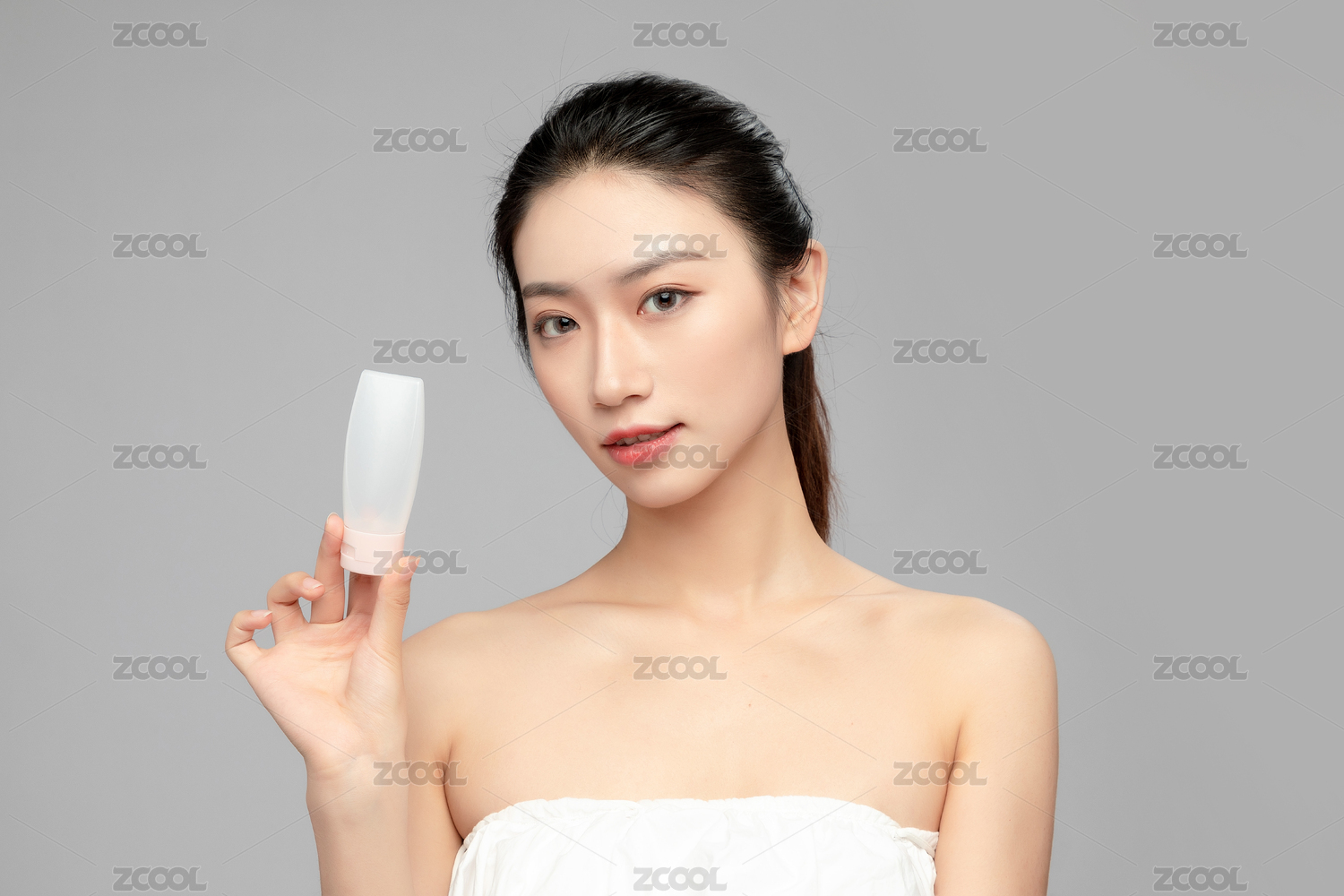 灰色背景里手中拿著洗面奶瓶子作為展示的亞洲美女面部特寫,化妝護膚整容