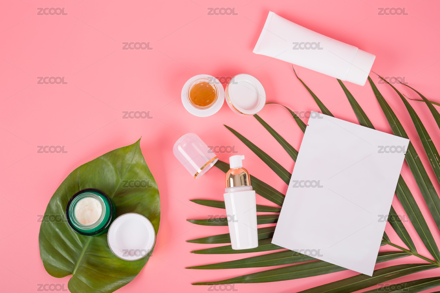 化妝品,面膜、精華、乳液等在粉色的背景上,護膚美容概念