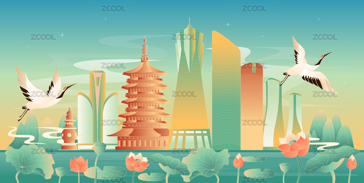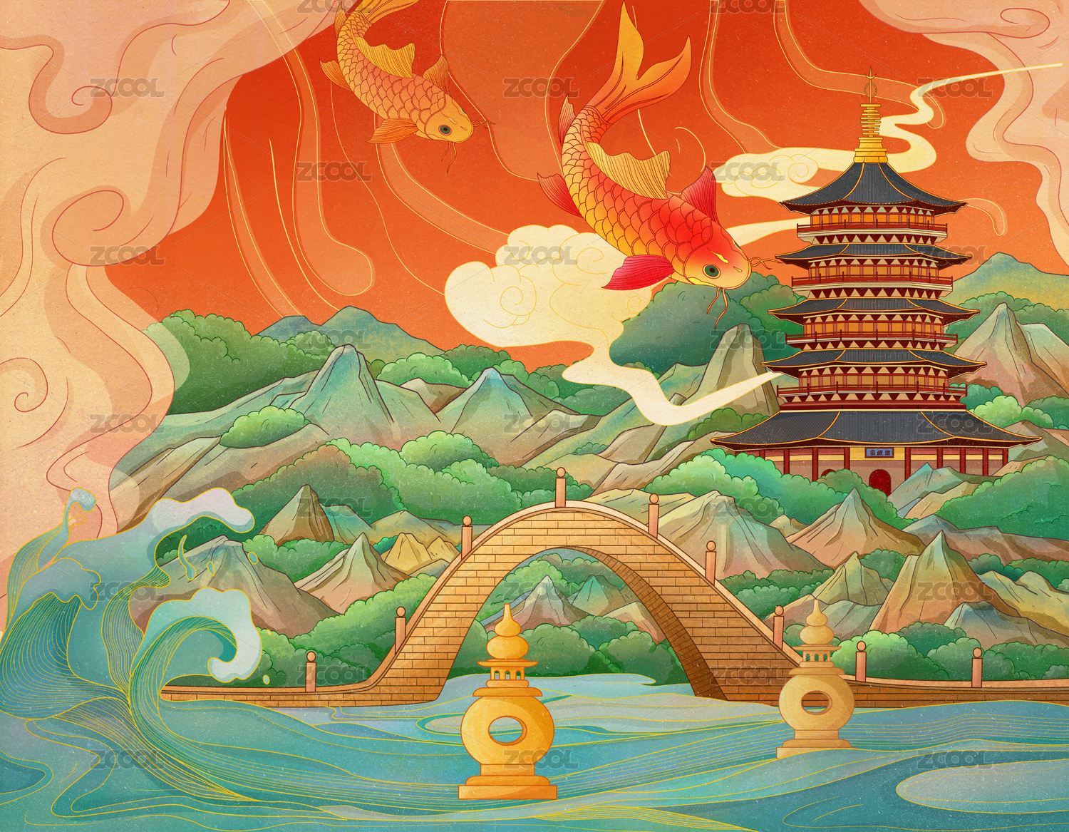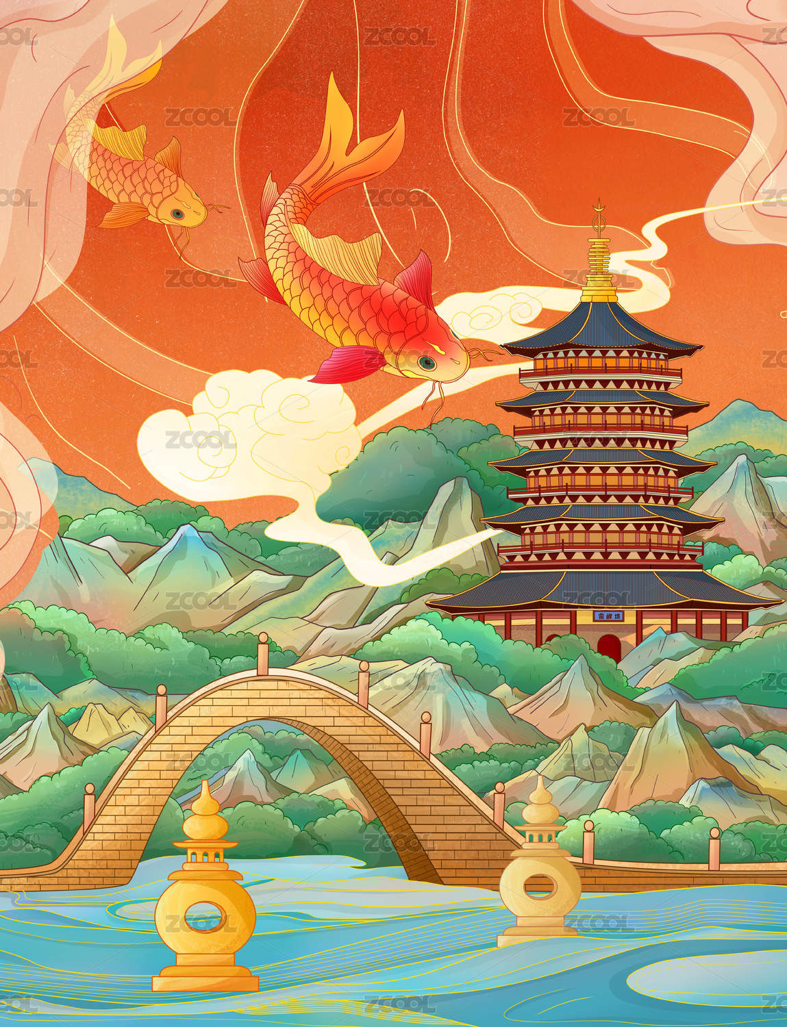 中國風杭州西湖雷峰塔原創(chuàng)插畫