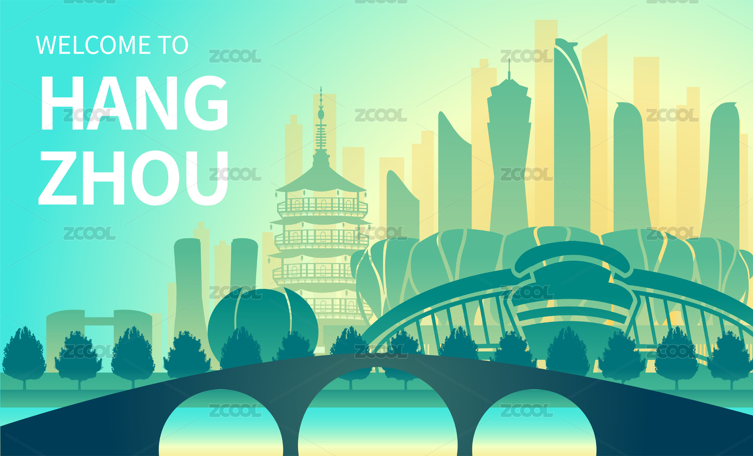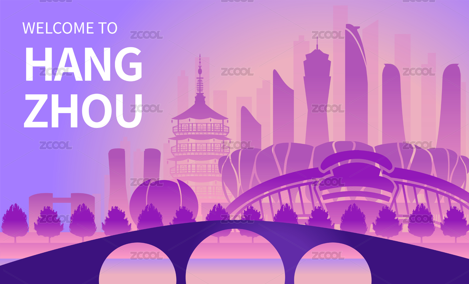 中國浙江省杭州市景觀扁平線性矢量插畫