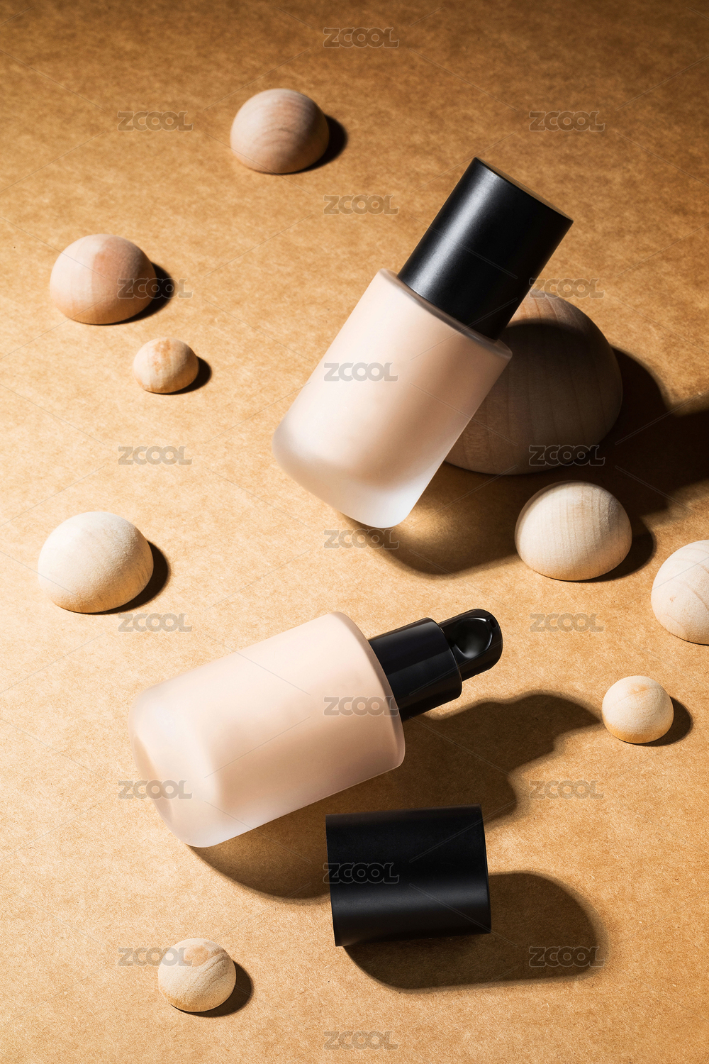白皙色遮瑕液和木球擺放陳舊木桌上