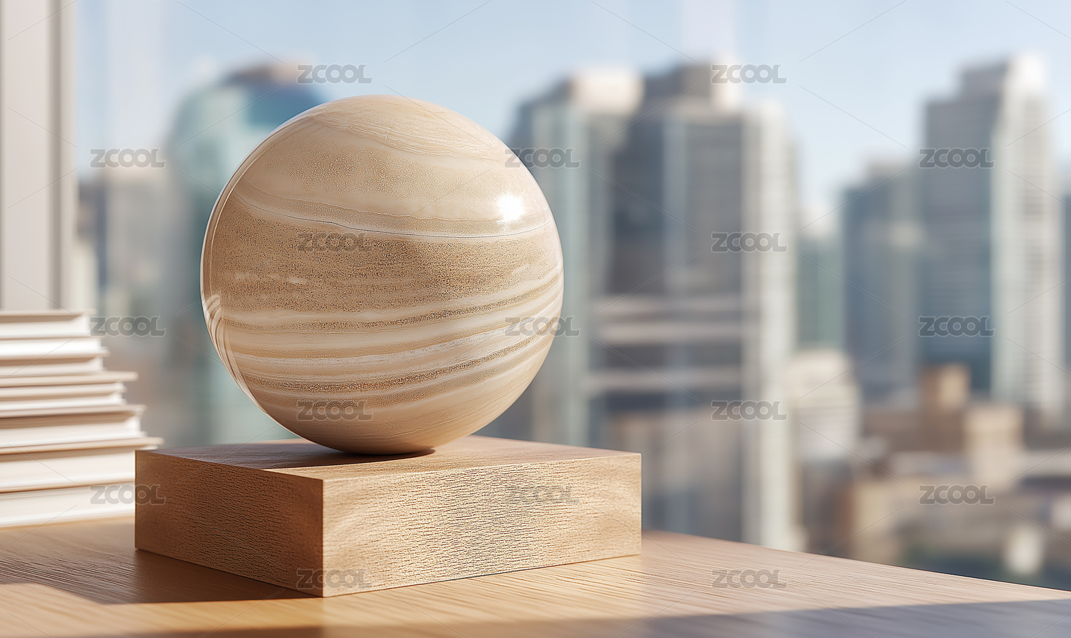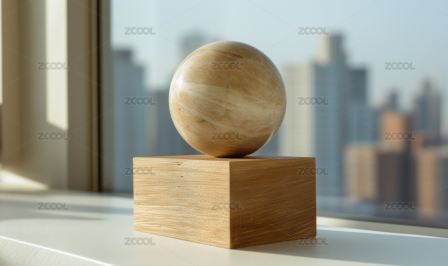 窗邊木座上置木質(zhì)圓球城市背景