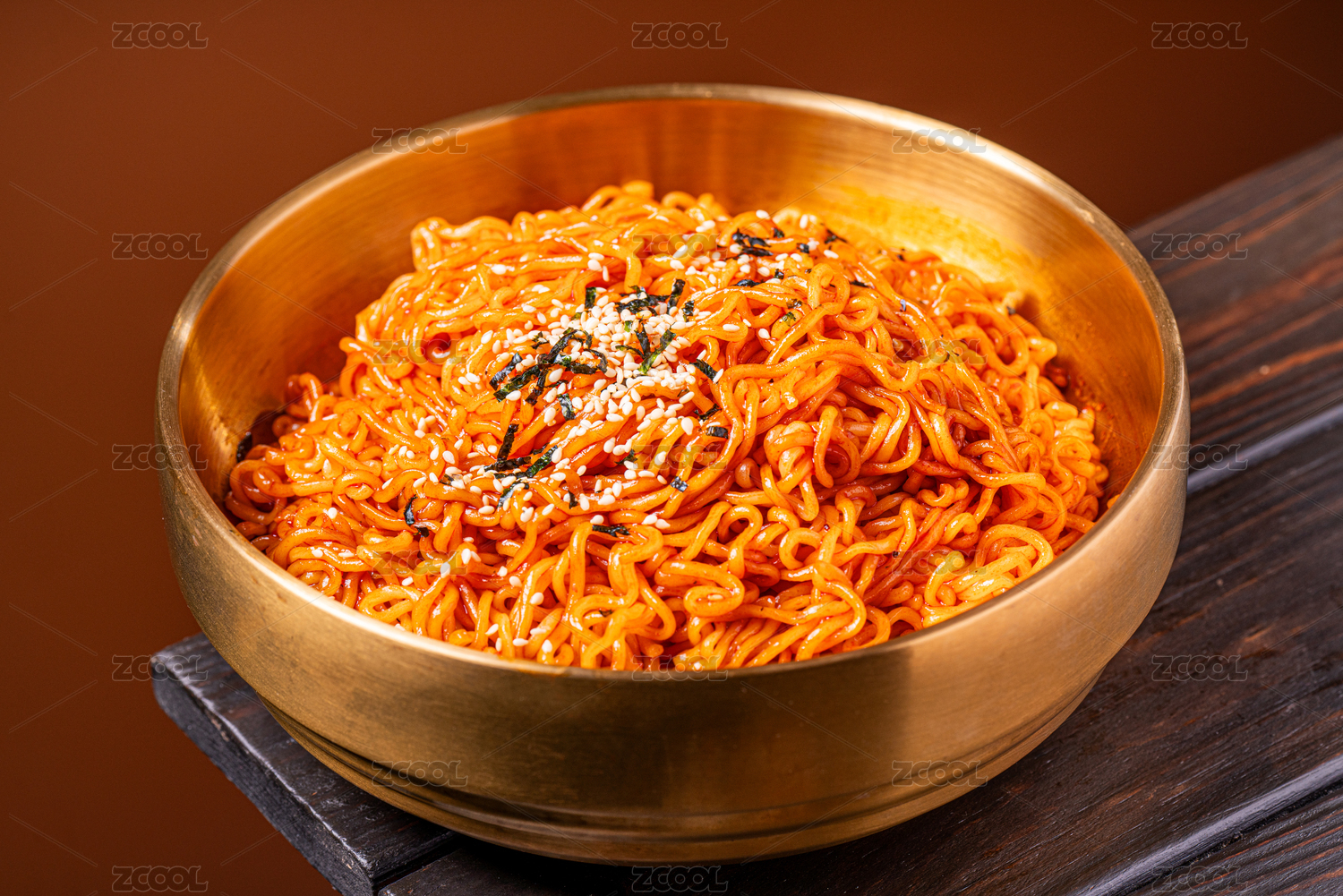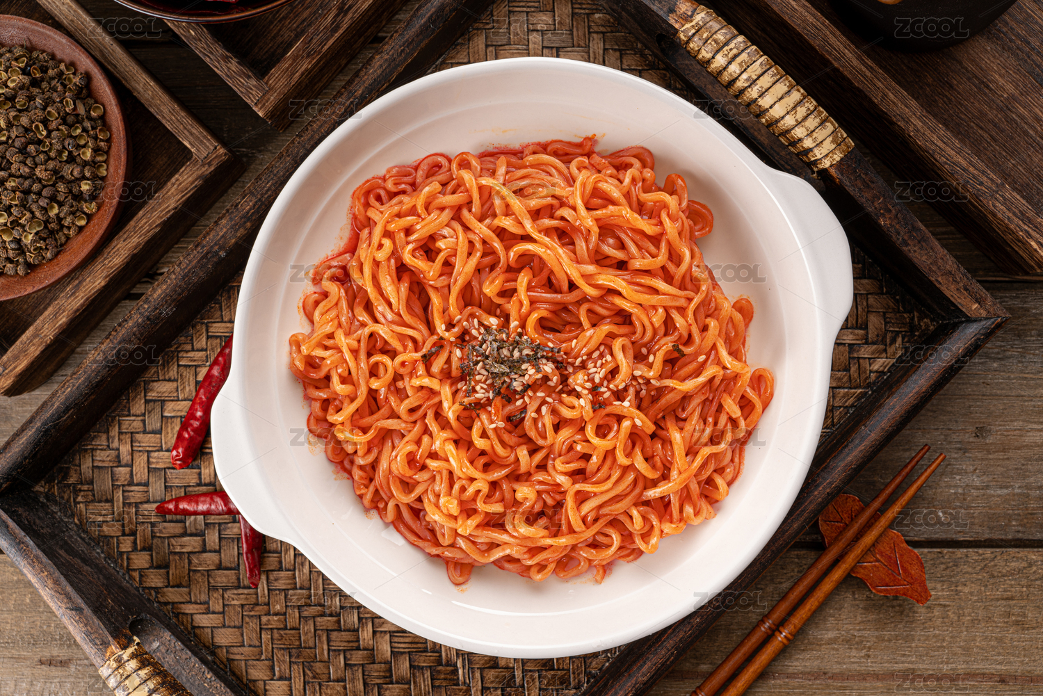 木板背景上一碗火雞面