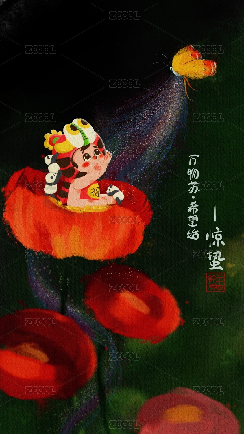 二十四節(jié)氣-驚蟄-娃娃坐在虞美人上追夢