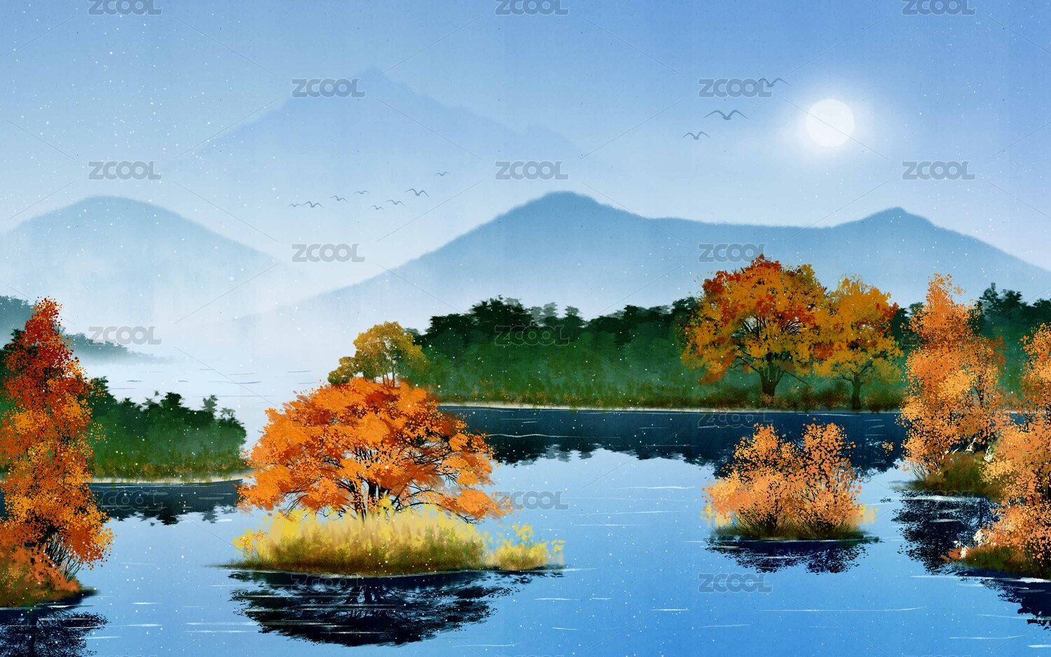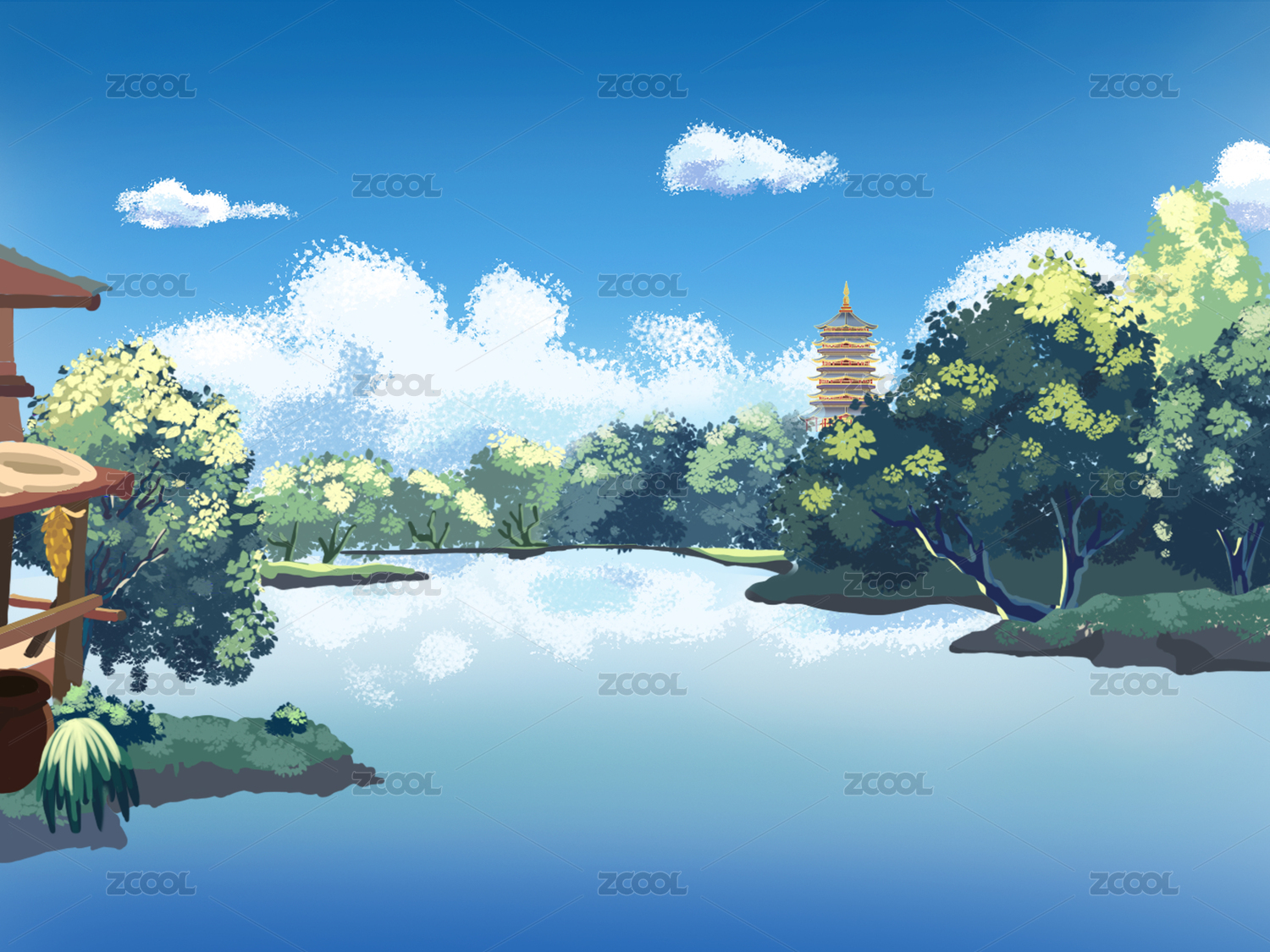 手繪夏季湖景