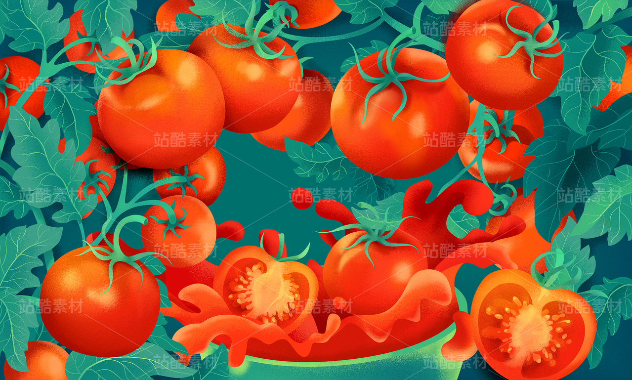 新鮮的番茄番茄汁藤葉噪點顆粒包裝插畫