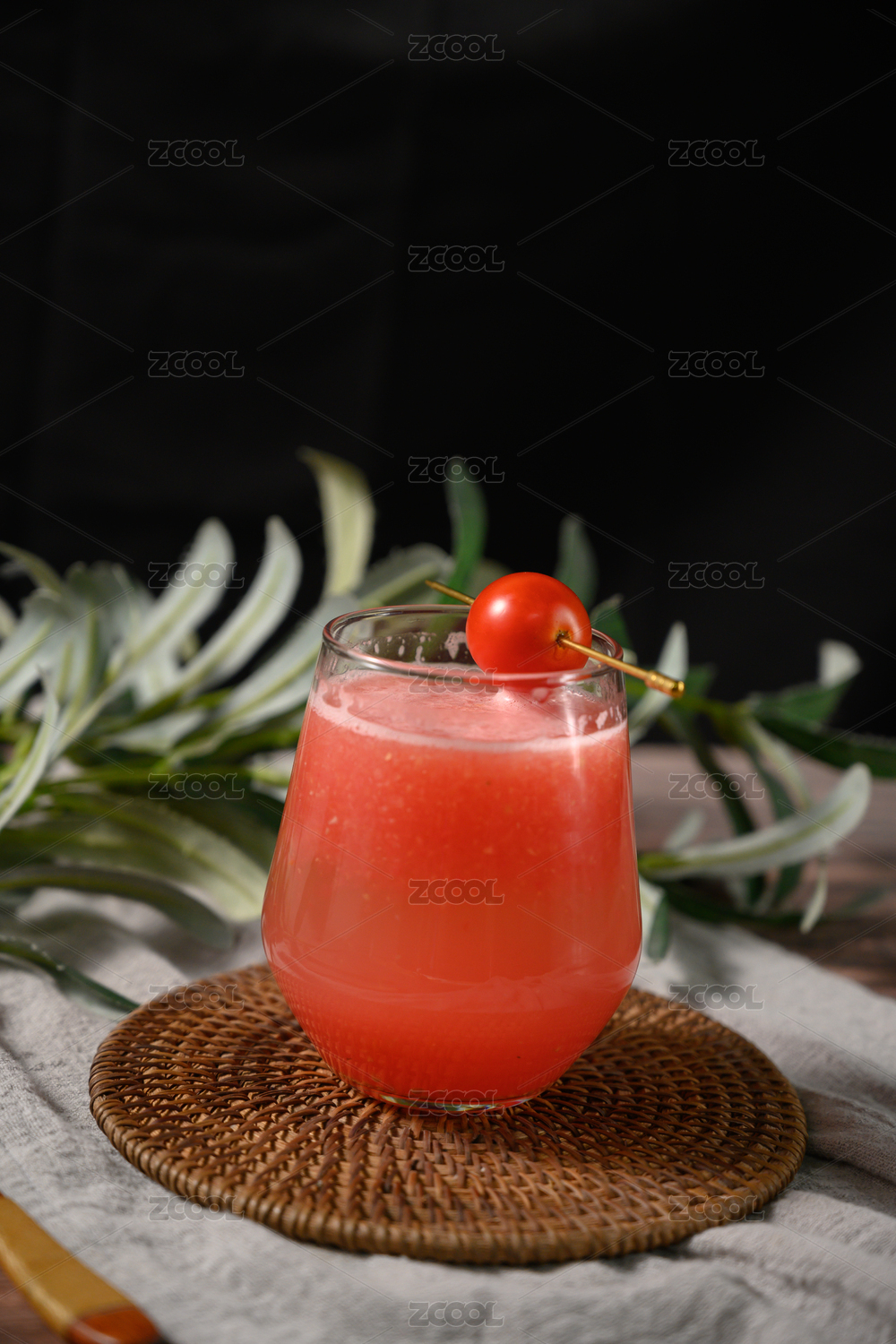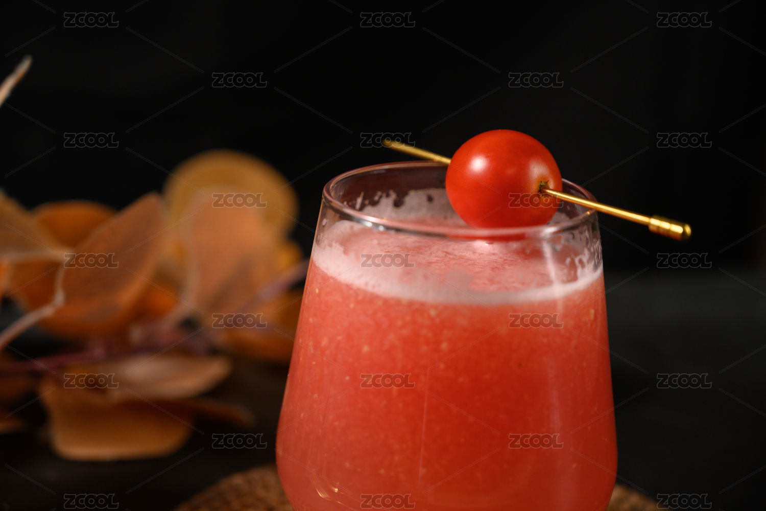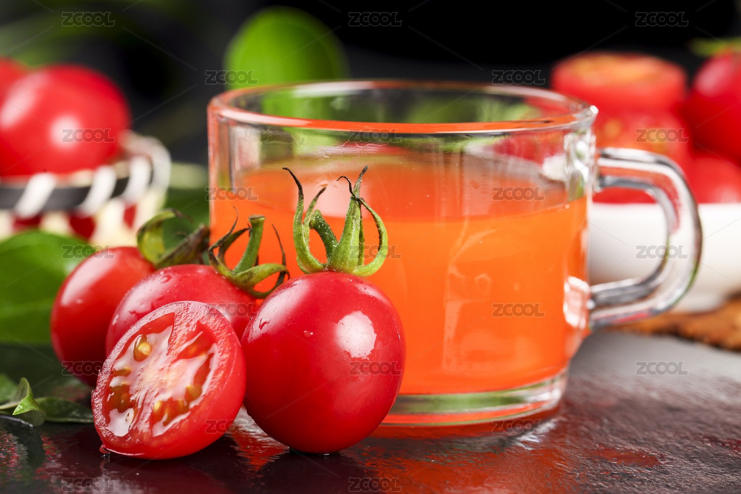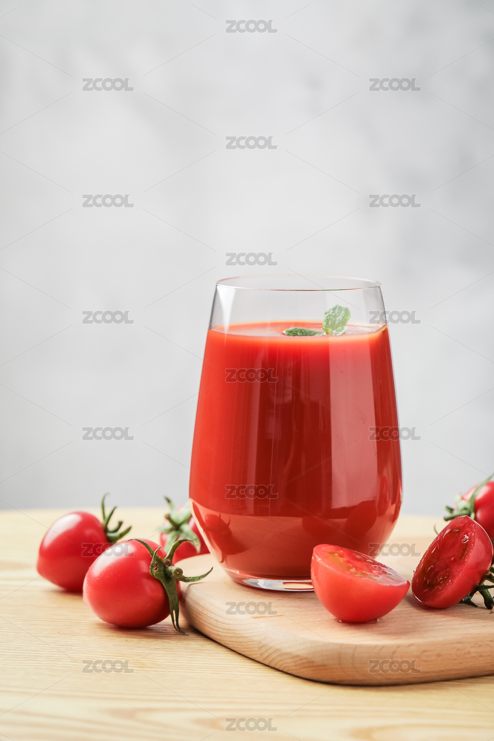用玻璃杯裝起來的番茄汁,番茄作為點綴。